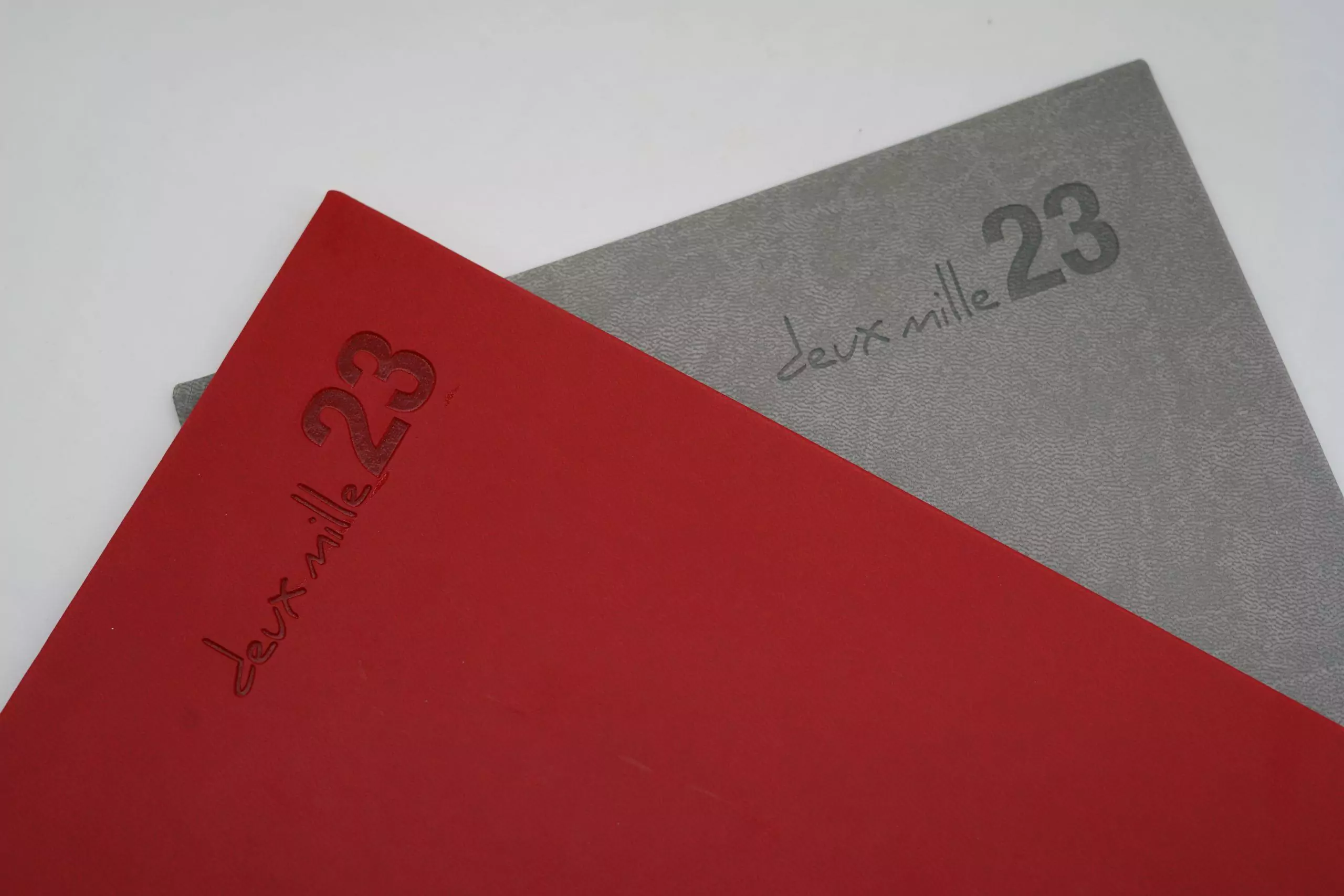 Les couvertures de nos agendas sont très épaisses et personnalisables en gaufrage ou en tampographie. Contactez nous pour en savoir plus et discuter de la technique de marquage choisie.