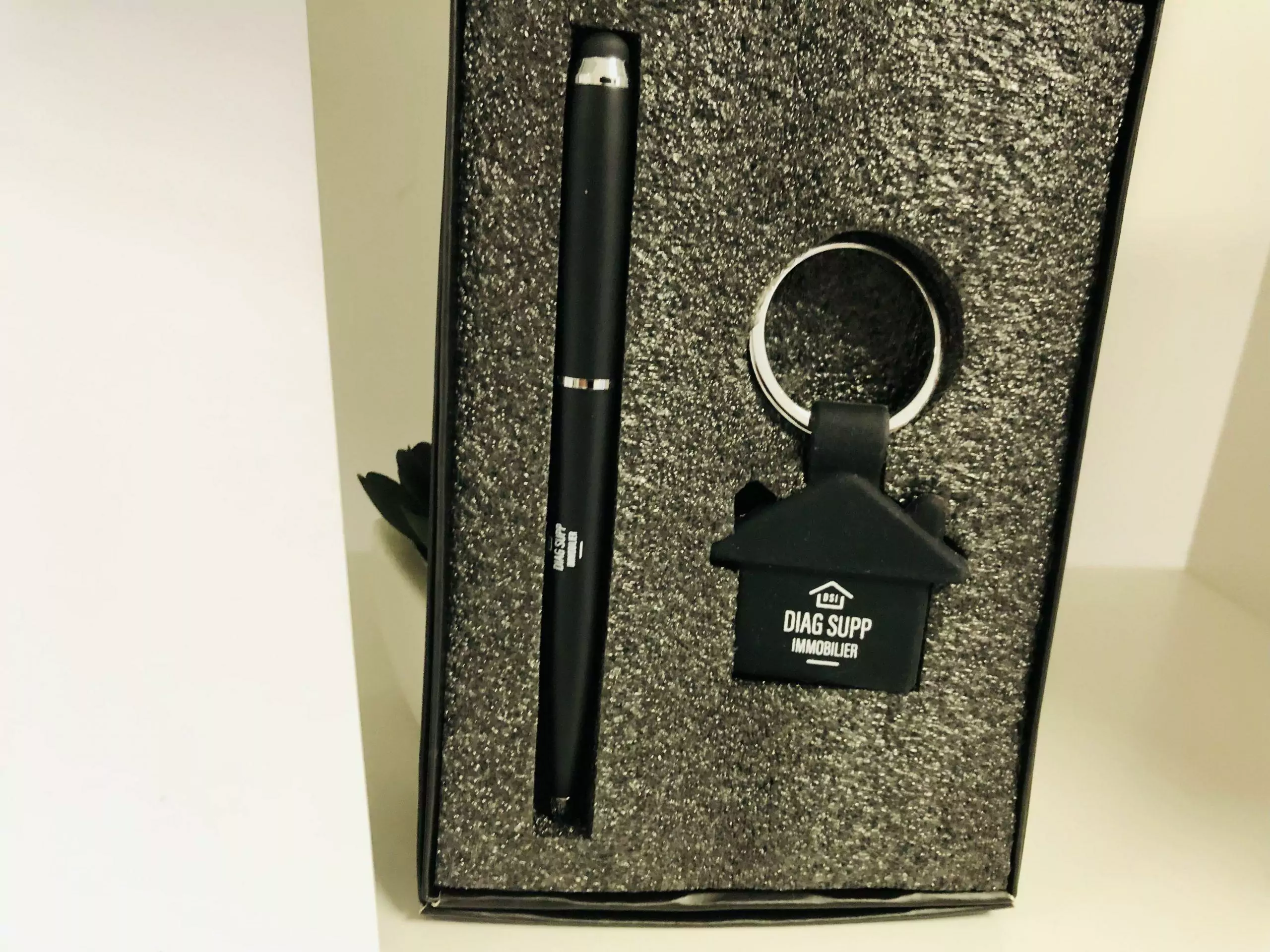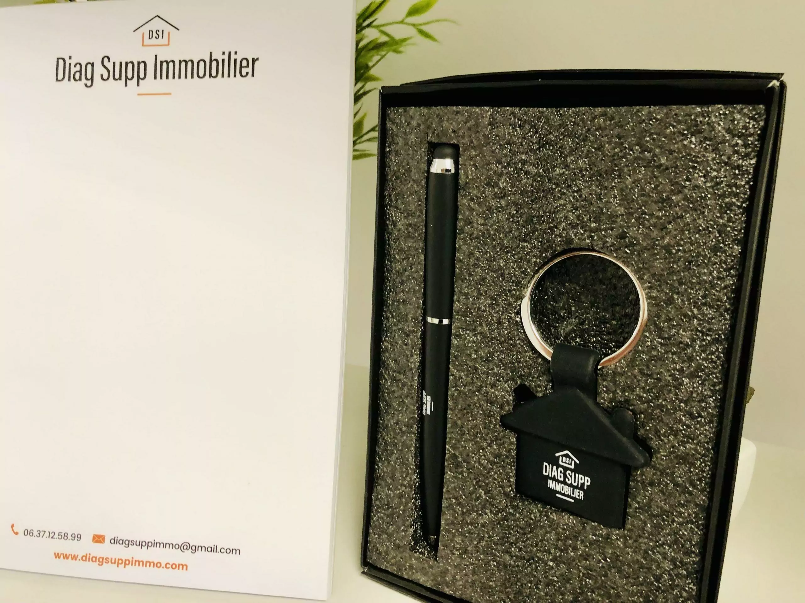 Ce kit coffret cadeau entreprise est composé d’un stylo noir et d’un porte-clé avec jeton rappelant le concept de l’immobilier. Le marquage est en 1 couleur blanc. Dans le cas où vous ne disposez pas de logos ou de charte graphique, nous pouvons nous en occuper puisque 2 graphistes professionnels et expérimentés sont présents en agence pour des réalisations graphiques sur mesure et soignées. Faites imprimer votre logo pour une visibilité permanente auprès de vos clients particuliers ou professionnels.