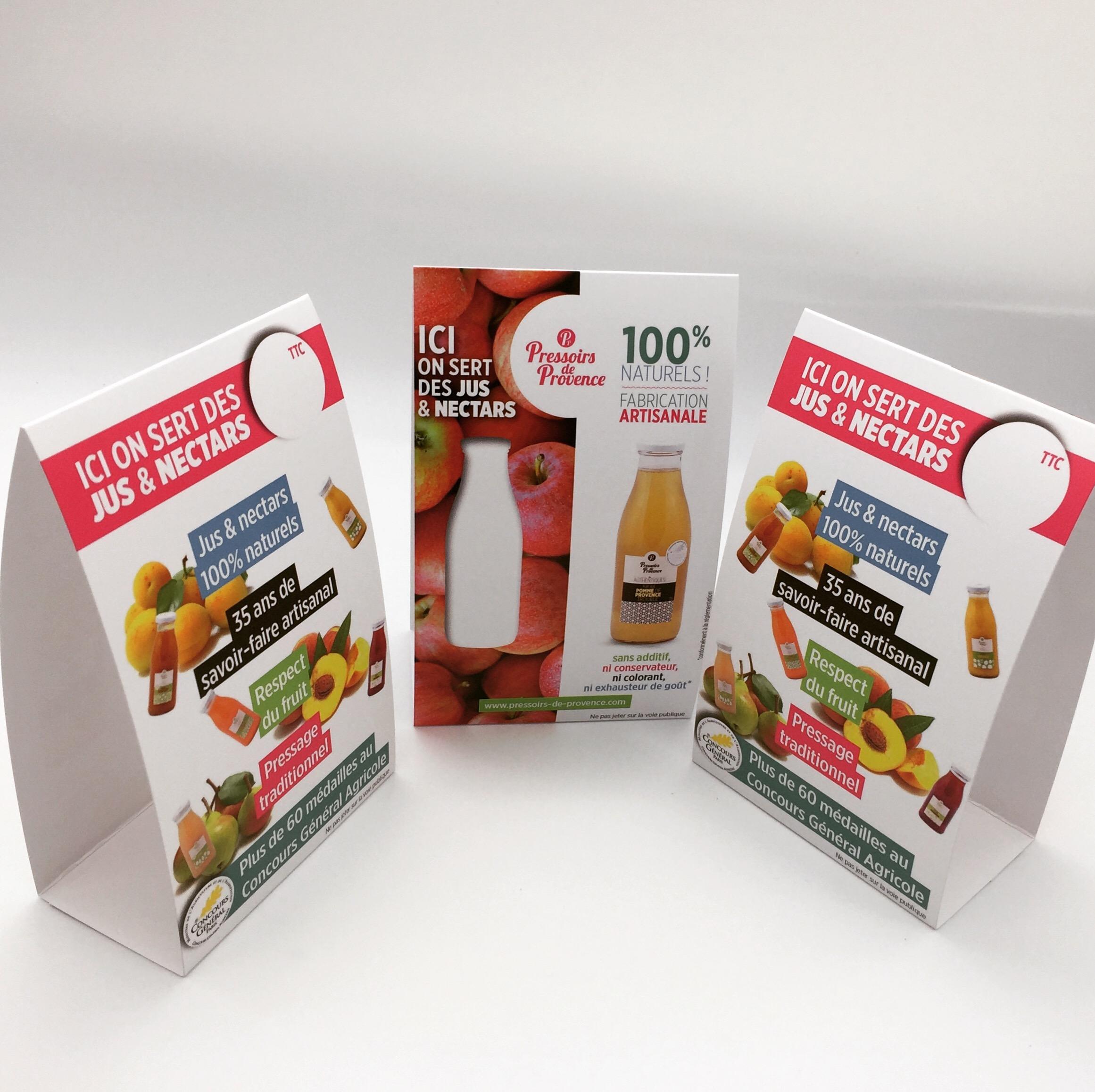 Création maquette graphique et impression de chevalets de table pour une entreprise de fruits et légumes dans les alpilles