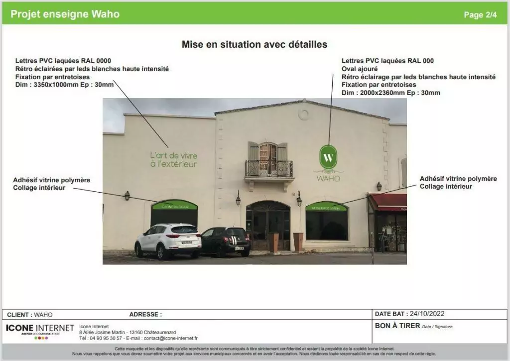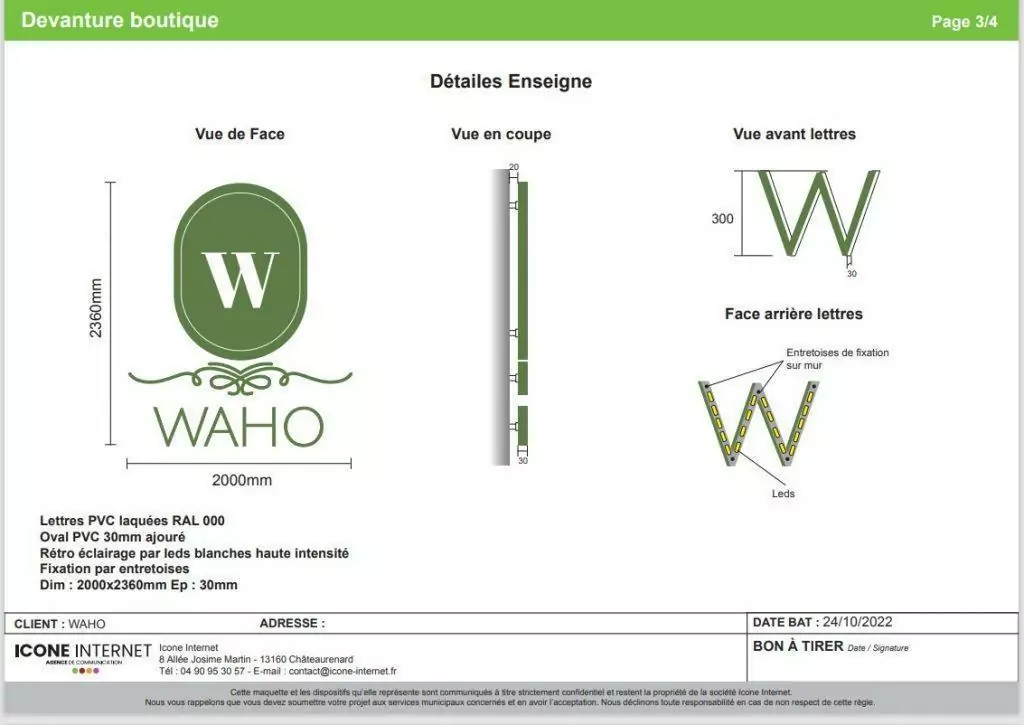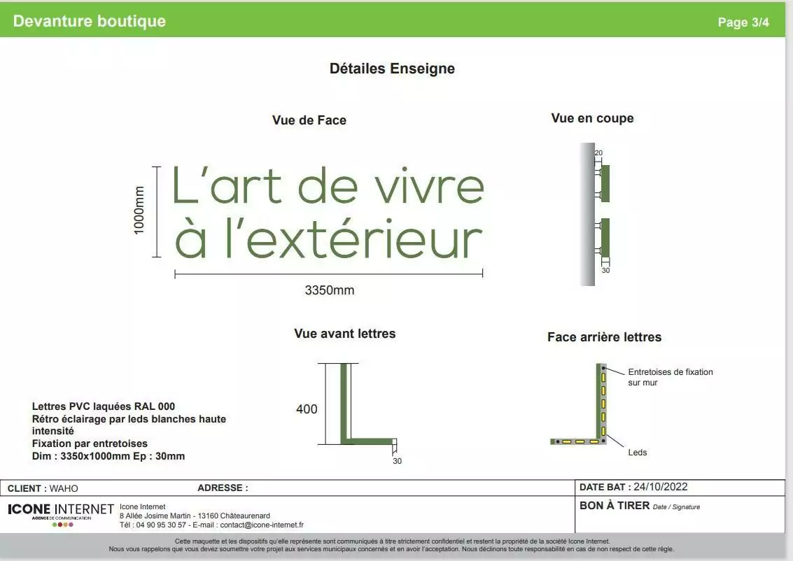 Comme vous pouvez le constater nos clients ont tous les éléments nécessaires pour se projeter et découvrir leur future enseigne. Notre bureau d’étude assure bien sur une traditionnelle mise en situation du projet, mais pousse la précision au maximum en donnant toutes les mesures et la matière sélectionnée pour votre projet. Il est disponible dans ce document des vues de face, en coupe, en situation. Pour certains projets nous réalisons des videos 3D toujours dans le but de se projeter au mieux.