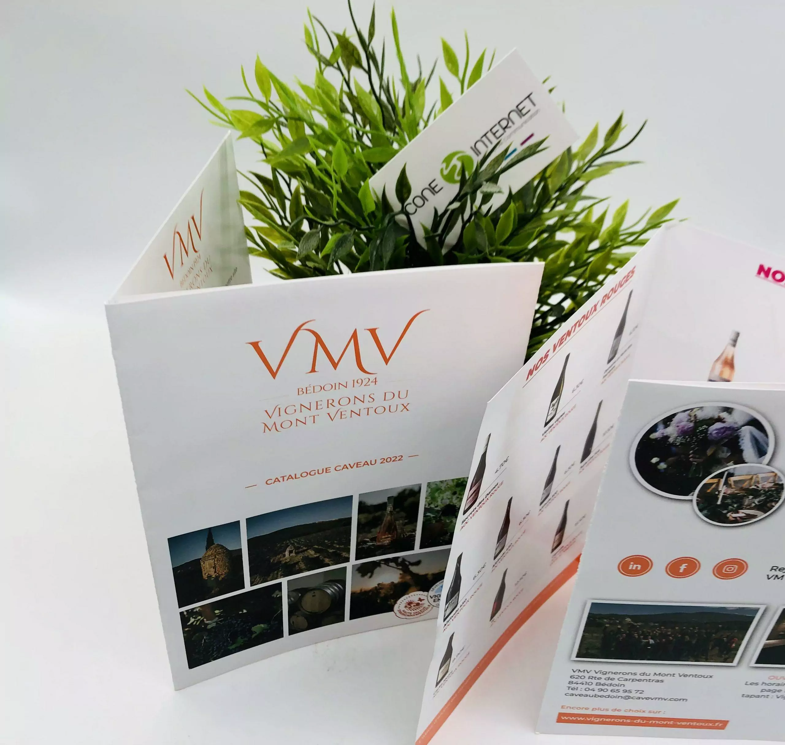 Votre expert en imprimerie a réalisé ce dépliant 3 volets pour un vigneron du Mont Ventoux. VMV a fait appel à nous pour réaliser un dépliant pour mettre en avant les cadeaux de 2022.