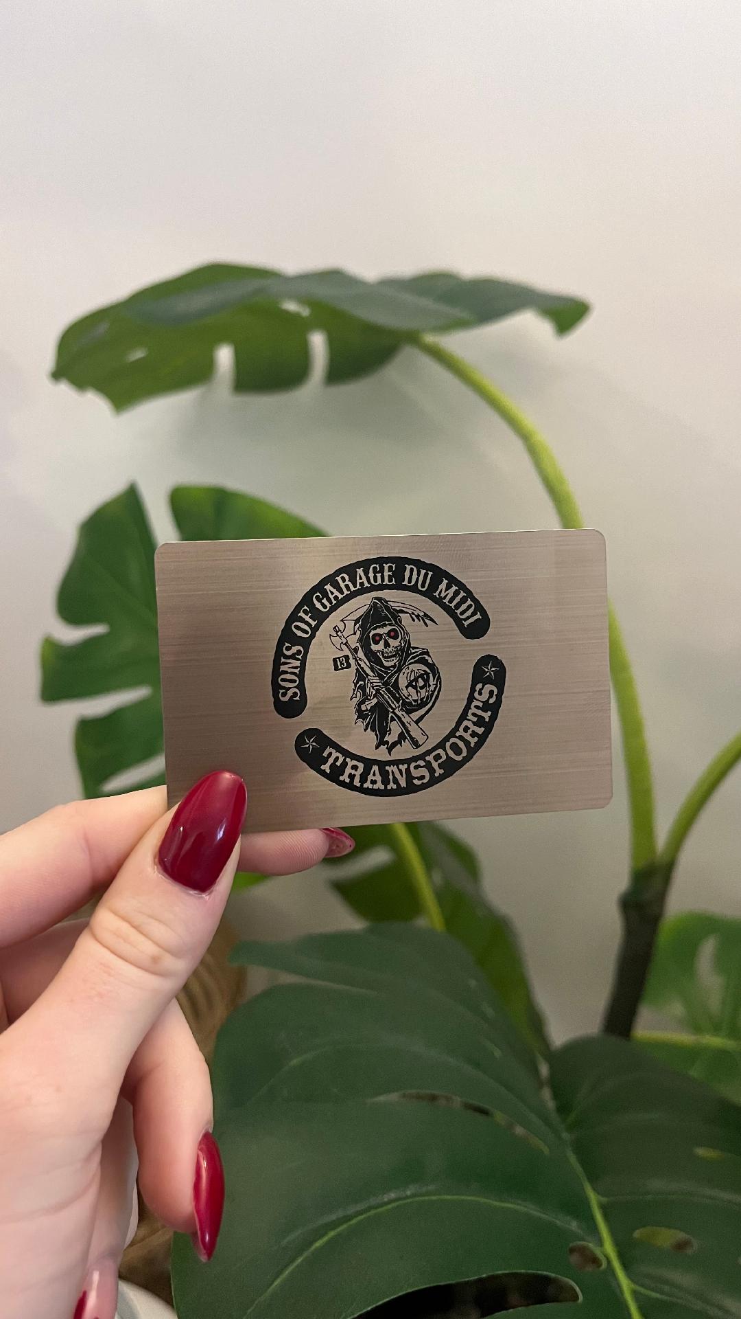 Le design noir imprimé sur le fond métallique clair crée un contraste fort et impactant 🎨. Cette opposition visuelle permet au logo et aux éléments graphiques de ressortir avec intensité. L’identité visuelle gagne en caractère et en présence. Une carte comme celle-ci ne passe pas inaperçue : elle attire le regard et suscite immédiatement la curiosité 👀.