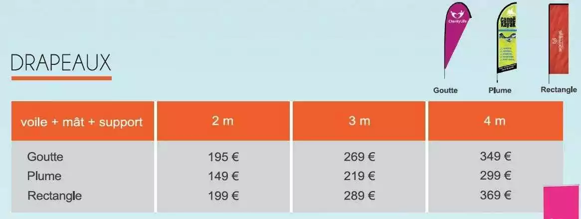 Le prix varie selon le modèle et la taille du drapeau. Choisissez selon vos gouts, couleurs et antcipez le futur visuel à implanter sur le drpeau publicitaire. Nous disposons en agence de multiples modèles et et exemples de beach flags en échantillon. Nous serions très heureux de vous recevoir et de vous les montrer pour pouvoir anticiper vos besoins en communication événementiel