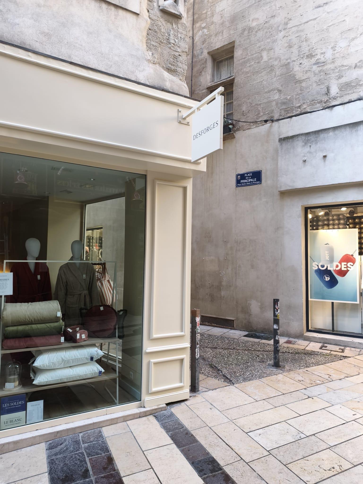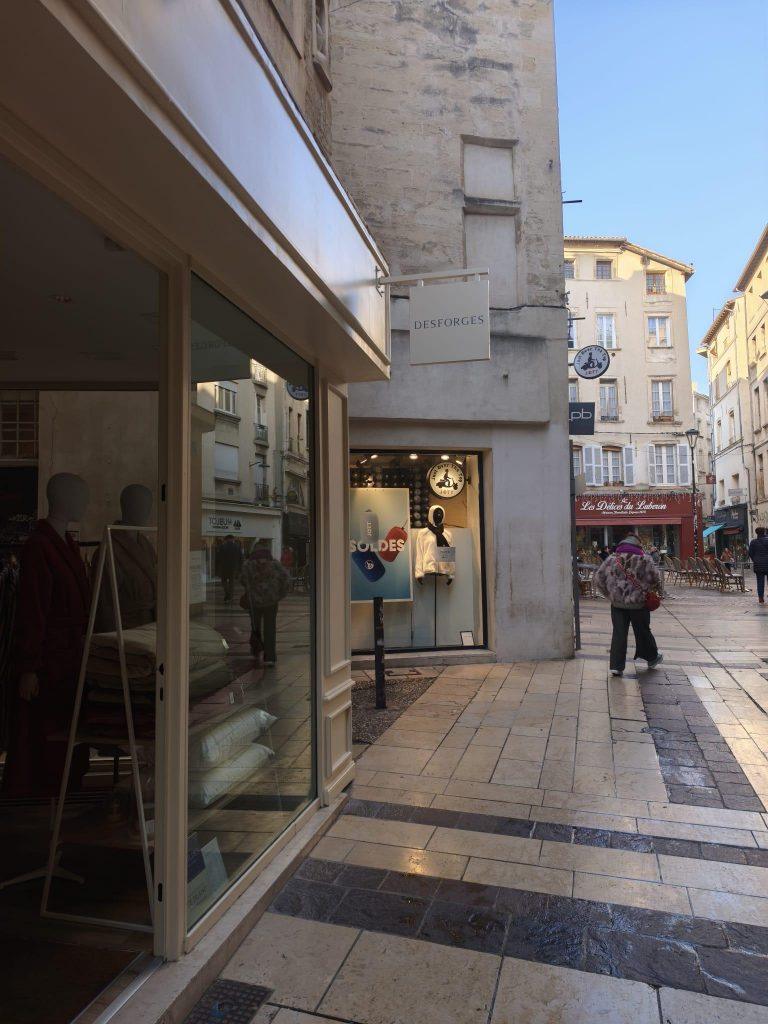 Boutique située en centre-ville d’Avignon, rue à fort passage piéton, façade peu visible depuis l’axe principal.