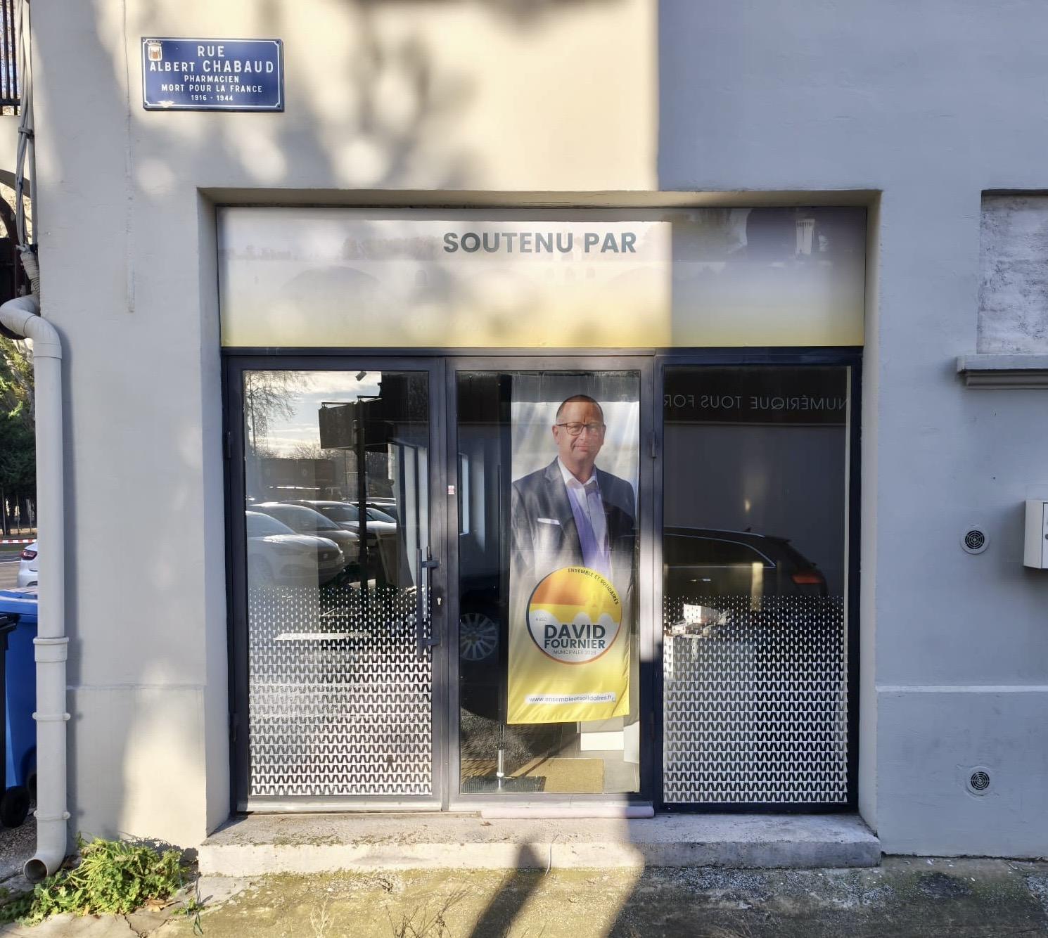 Après une étude de l’emplacement et du quartier, ICONE INTERNET a proposé une enseigne grand format, parfaitement lisible depuis la rue, intégrant le nom du candidat, le slogan et les codes couleurs de la campagne.