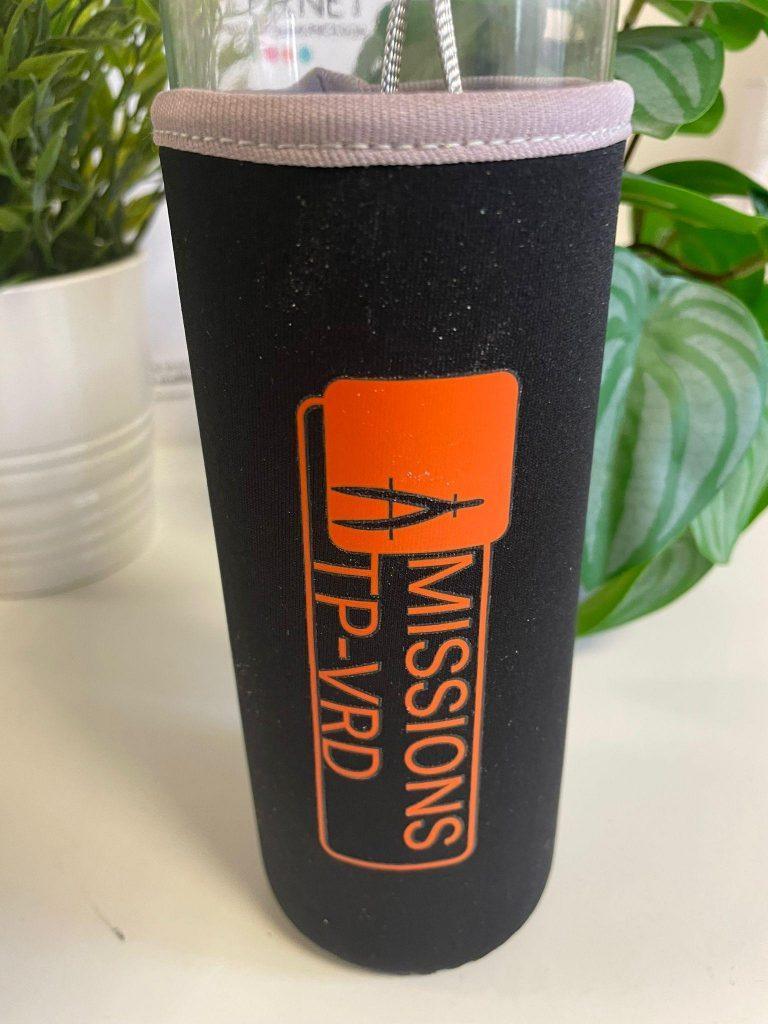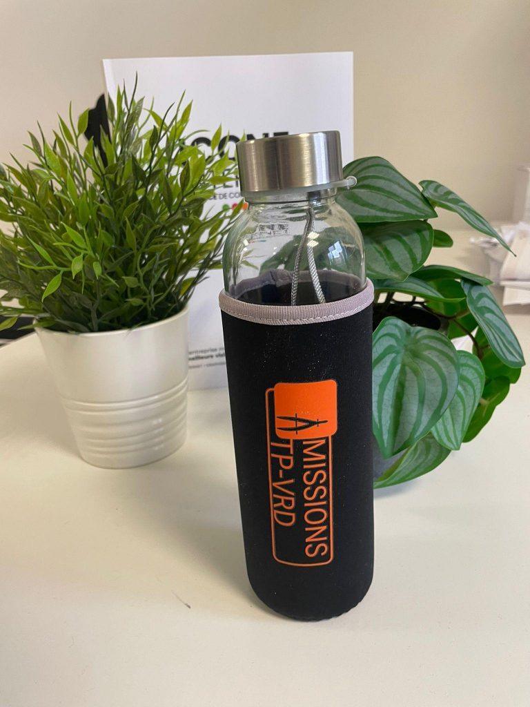 Mission TP VRD, entreprise de travaux publics basée à Barbentane, nous a confié la création de gourdes en verre personnalisées pour leurs équipes et clients.
