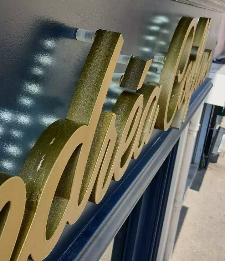 Les lettres découpées non lumineuses sont généralement disponibles en dibond ( 3mm d’épaisseur ) ou PVC laqué selon le RAL de votre choix. Elles sont découpées à la forme exacte de la police sélectionnée.