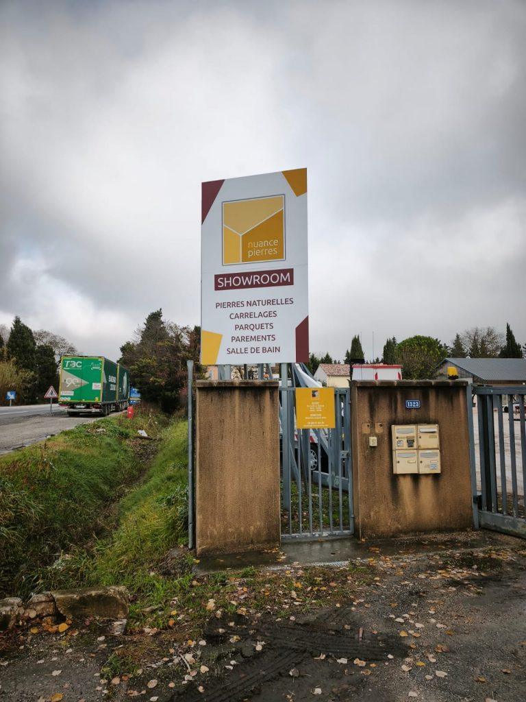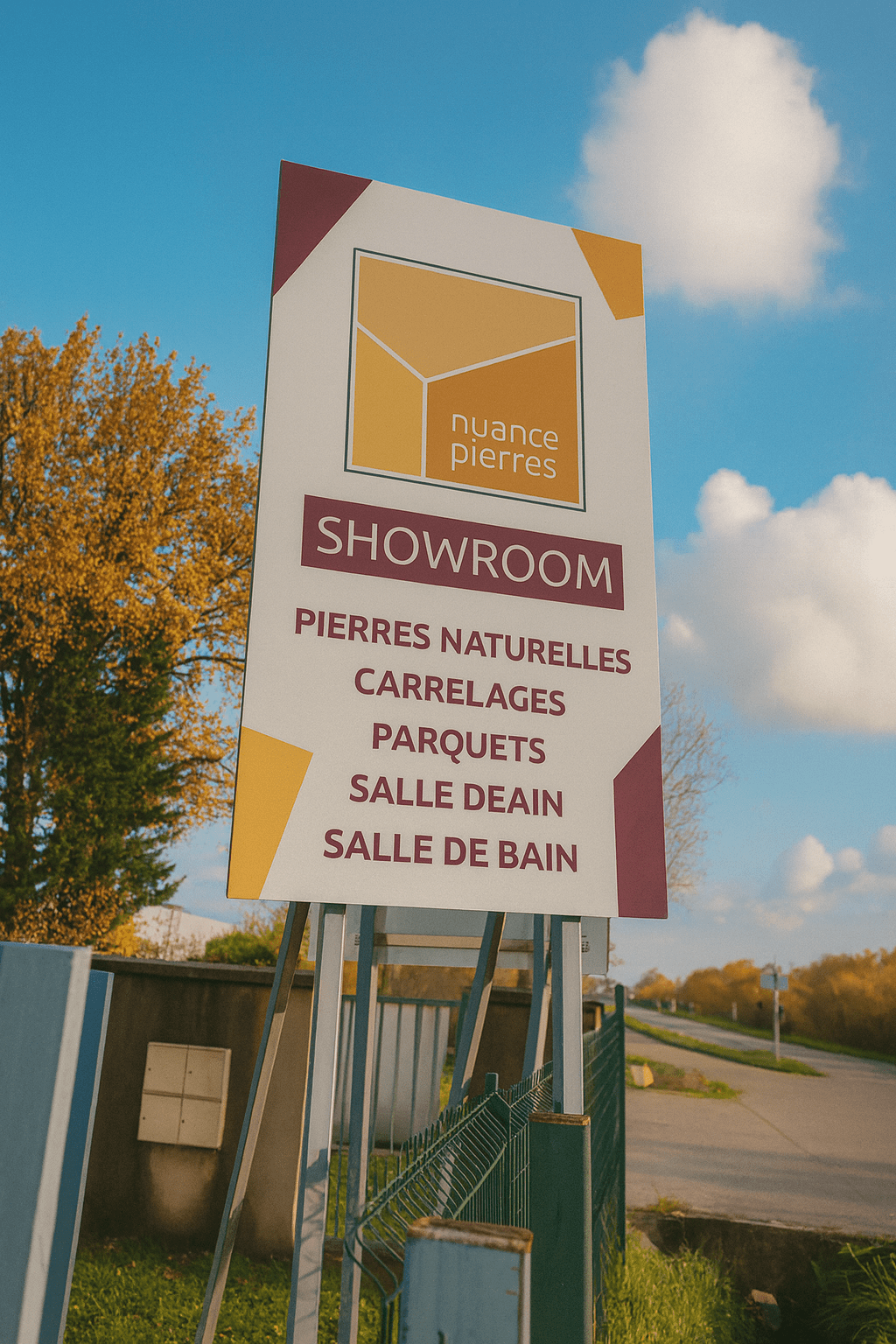 Ces images racontent finalement bien plus qu’une simple signalétique : elles illustrent l’histoire d’une entreprise locale engagée, passionnée et fière de son savoir-faire. Grâce à un affichage soigné et impactant, Nuance Pierres affirme son positionnement comme référence incontournable des matériaux nobles pour embellir, rénover ou transformer les espaces 🏠✨.