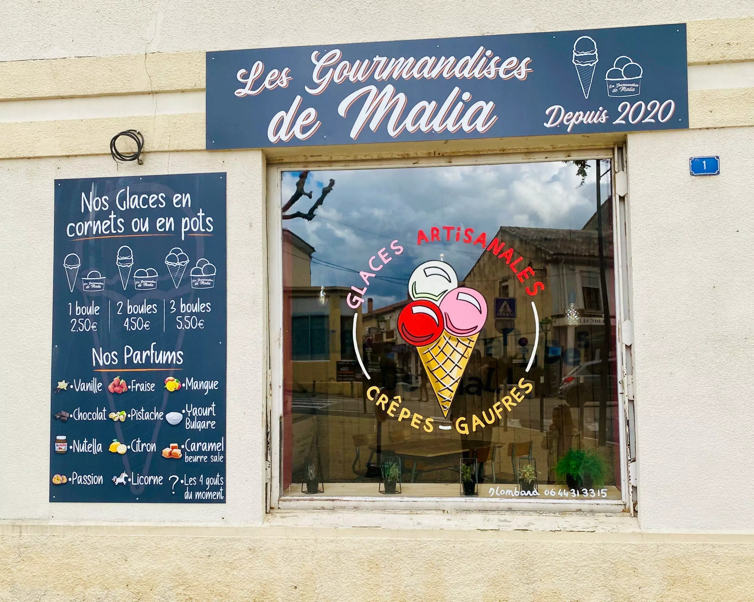 Ce projet concerne une enseigne restaurant glacier. Le client originaire de Mallemort nous a sollicité pour la refonte entière de sa signalétique. Celle-ci devait être relookée car la charte graphique et le logo venaient d’être refaits. La prestation concerne un habillage vitrine avec peinture faite à la main et 2 panneaux alu. Le premier panneau concerne les tarifs et les différents parfums de glaces disponibles dans ce glacier réputé. La deuxième enseigne concerne elle le nom du glacier pour le signaler fortement auprès des jeunes de ce village des Alpilles.