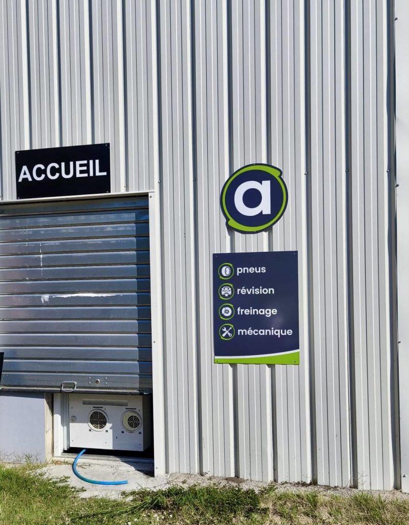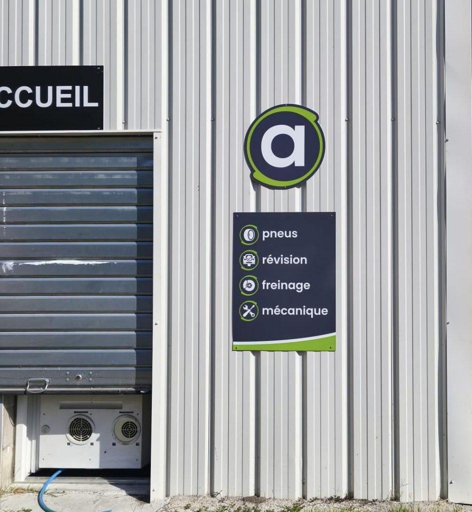 Nos graphistes ont imaginé une enseigne lumineuse en lettres boîtier rétroéclairées, associée à des panneaux directionnels en dibond pour guider les clients vers l’atelier et la réception.