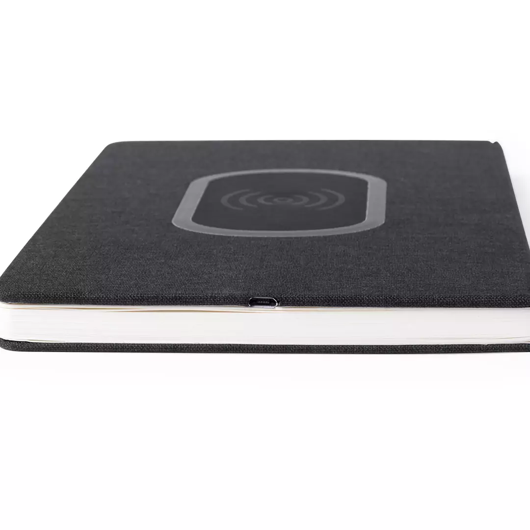 Chargeur de cahier en polyester 300D robuste avec chargeur sans fil intégré. Conception sobre et station de recharge originale sur le couvercle. Inclut 80 feuilles avec un arrangement de rayure.