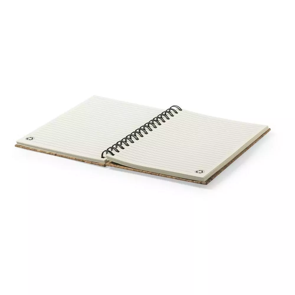 Carnet à spirales A5, gamme éco-friendly. Avec couverture rigide en liège et fermeture par élastique noir. De 100 feuilles lignées éco.