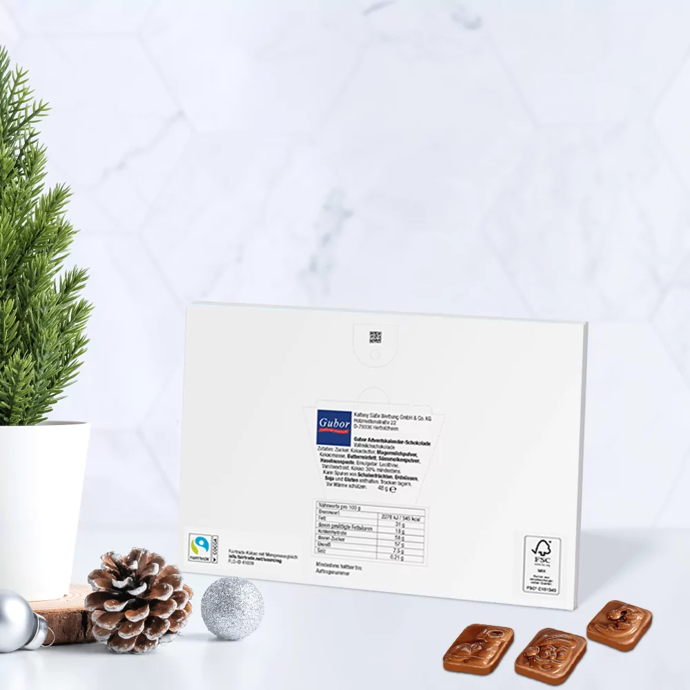 La meilleure période de l’année approche, fêtez-la avec un Calendrier de l’Avent petit format personnalisé ! C’est le cadeau idéal pour offrir à vos clients, collègues ou vos proches. Ce coffret offre 24 petits chocolats au lait de la marque Gubor. Ce chocolat délicieux est certifié commerce équitable ! La boîte A5 est parfaite pour y ajouter votre design unique ou le logo de votre entreprise. Remerciez vos clients ou votre personnel avec un cadeau original et gourmand pour les fêtes de Noël et de fin d’année ! Commandez dès aujourd’hui.
