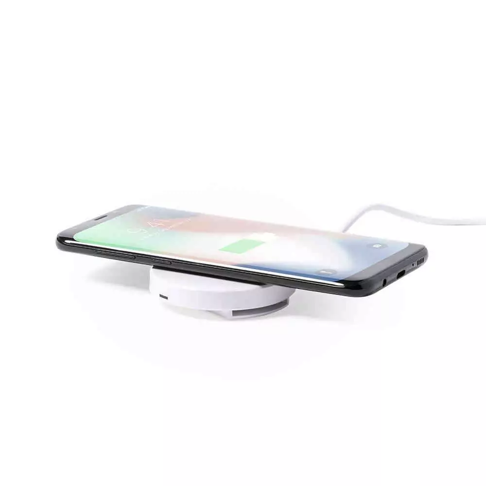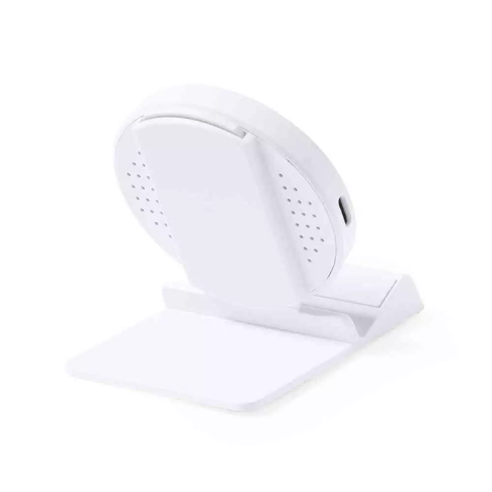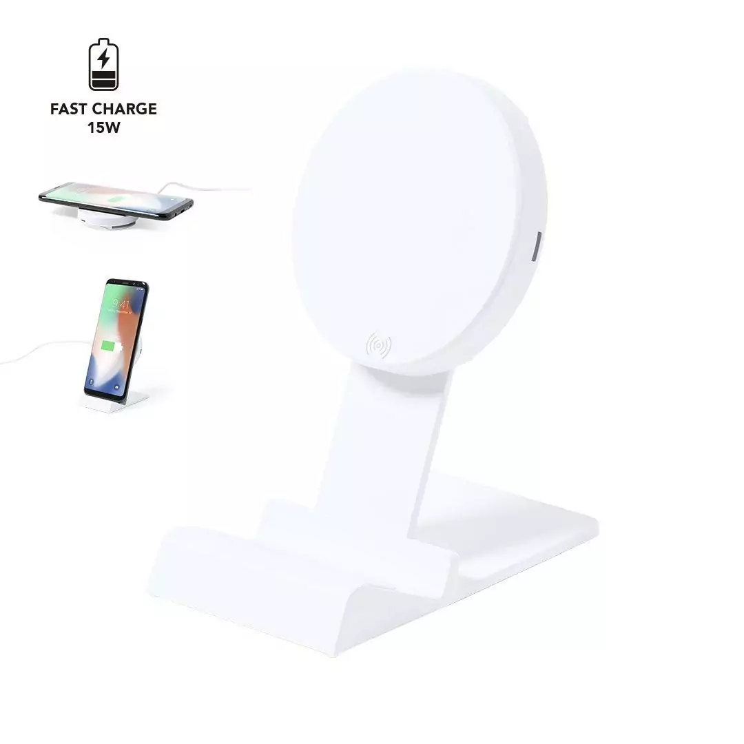 hargeur sans fil à charge rapide de 15 W. Dans une finition blanche élégante, avec base de charge réglable en hauteur et fonction du support de smartphone. Compatible avec les appareils équipés de la technologie de charge sans fil. Câble de charge de type C inclus, avec une grande surface de marquage et présenté dans une boîte de conception attrayante. Manuel d’instructions disponible en espagnol et en anglais.