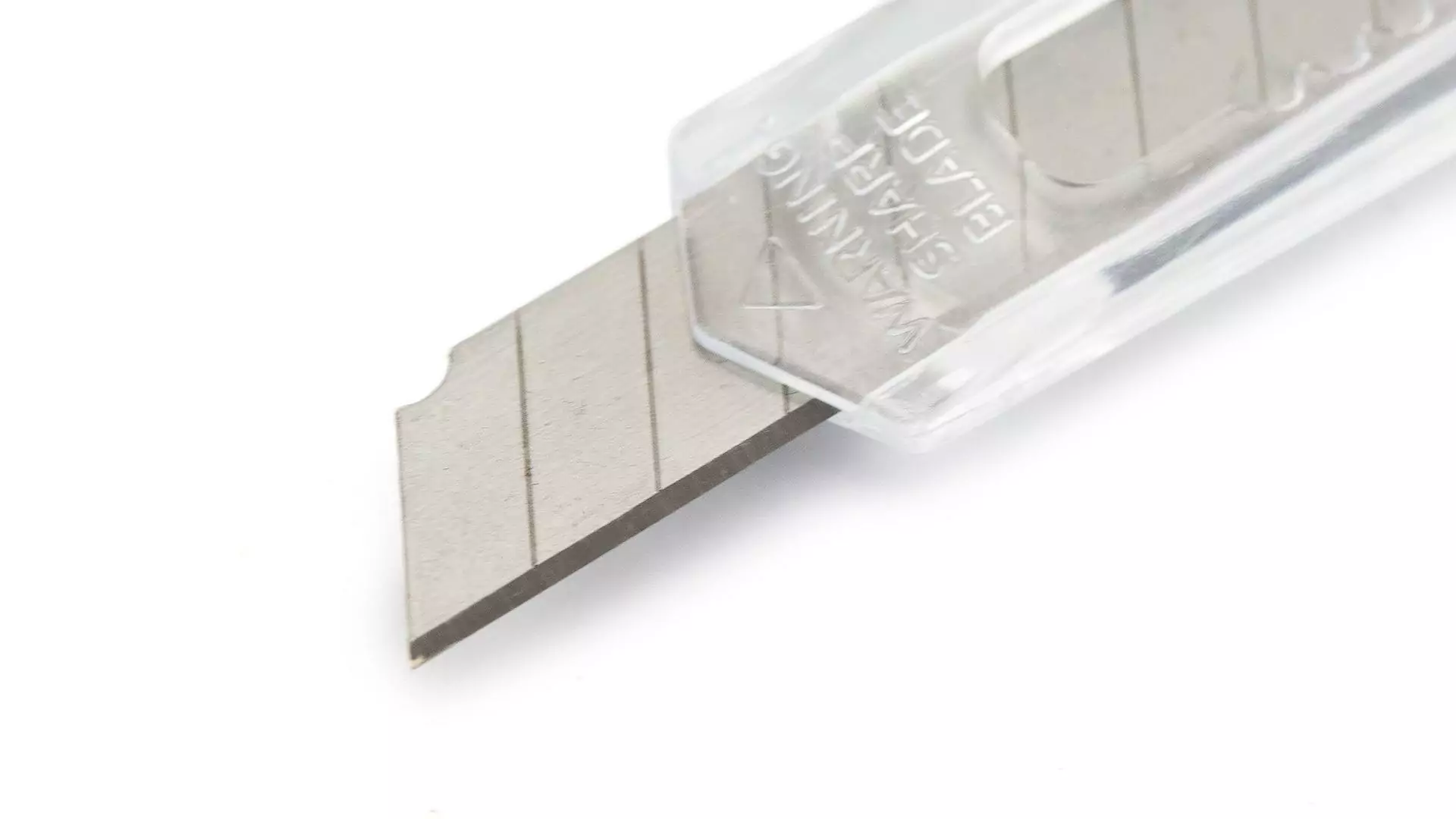Cutter avec lame aluminium et corps transparent. Verrouillage de sécurité et embout amovible pour régler la longueur de la lame.