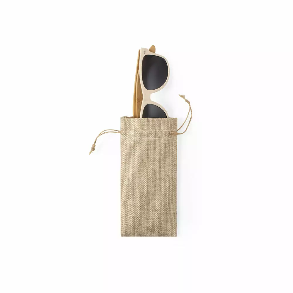 Etui en polyester, écru avec fermeture par cordelettes réglables et intérieur doux.