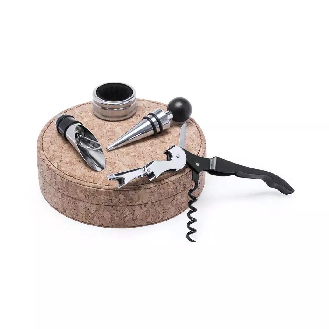 Goodies ensemble à vin dans un coffret rond en liège naturel avec intérieur en mousse beige. Accessoires en acier inoxydable : un tire-bouchon à 2 crans avec coupe-capsule et décapsuleur, un bouchon élégant, un bec verseur et un anneau anti-gouttes.