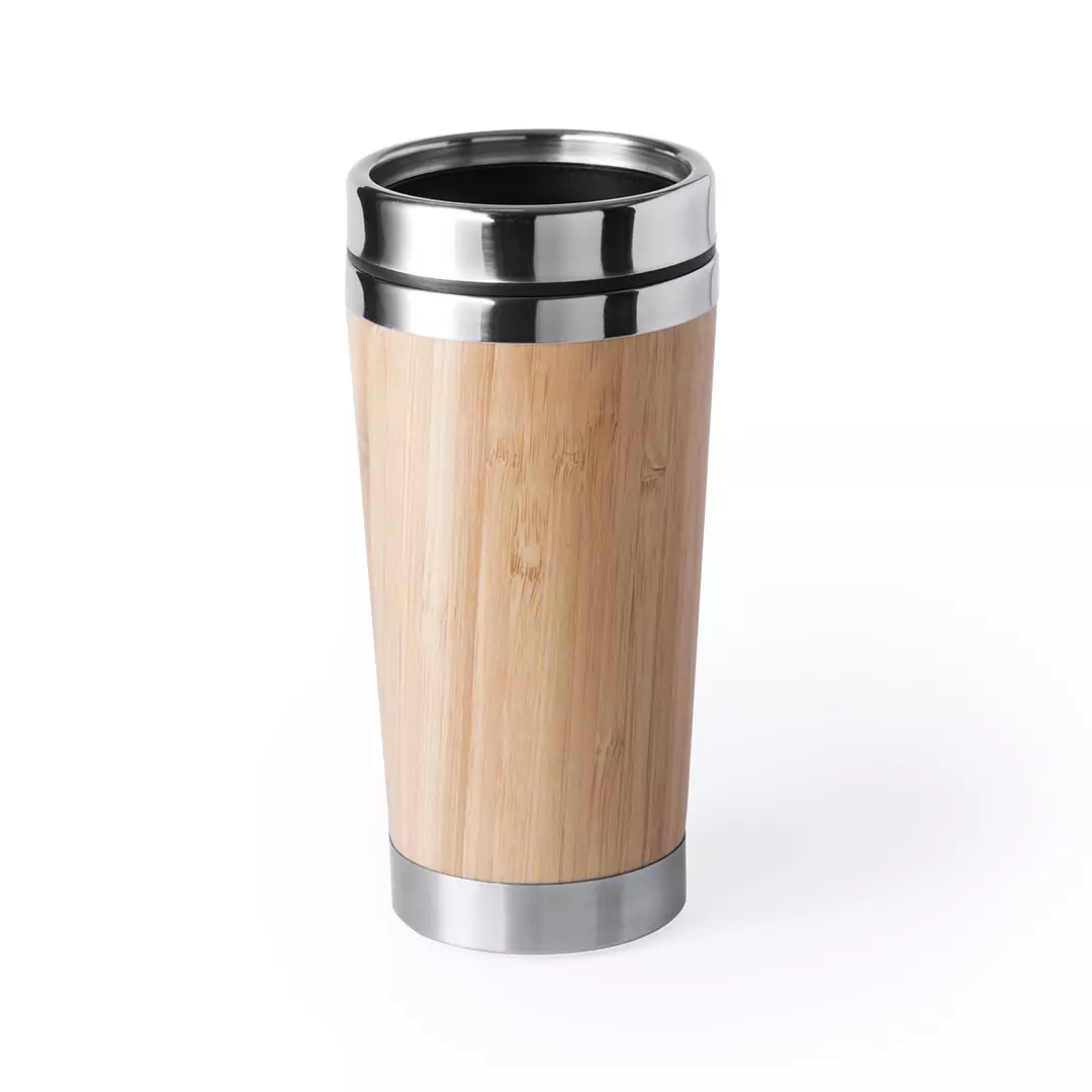 Gobelet de voyage en acier inoxydable de finition bambou, d une capacité de 500 ml. Avec couvercle dosificateur de sécurité. Présentation boite individuelle design.