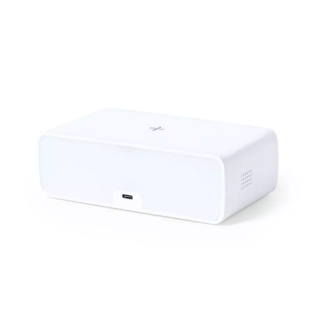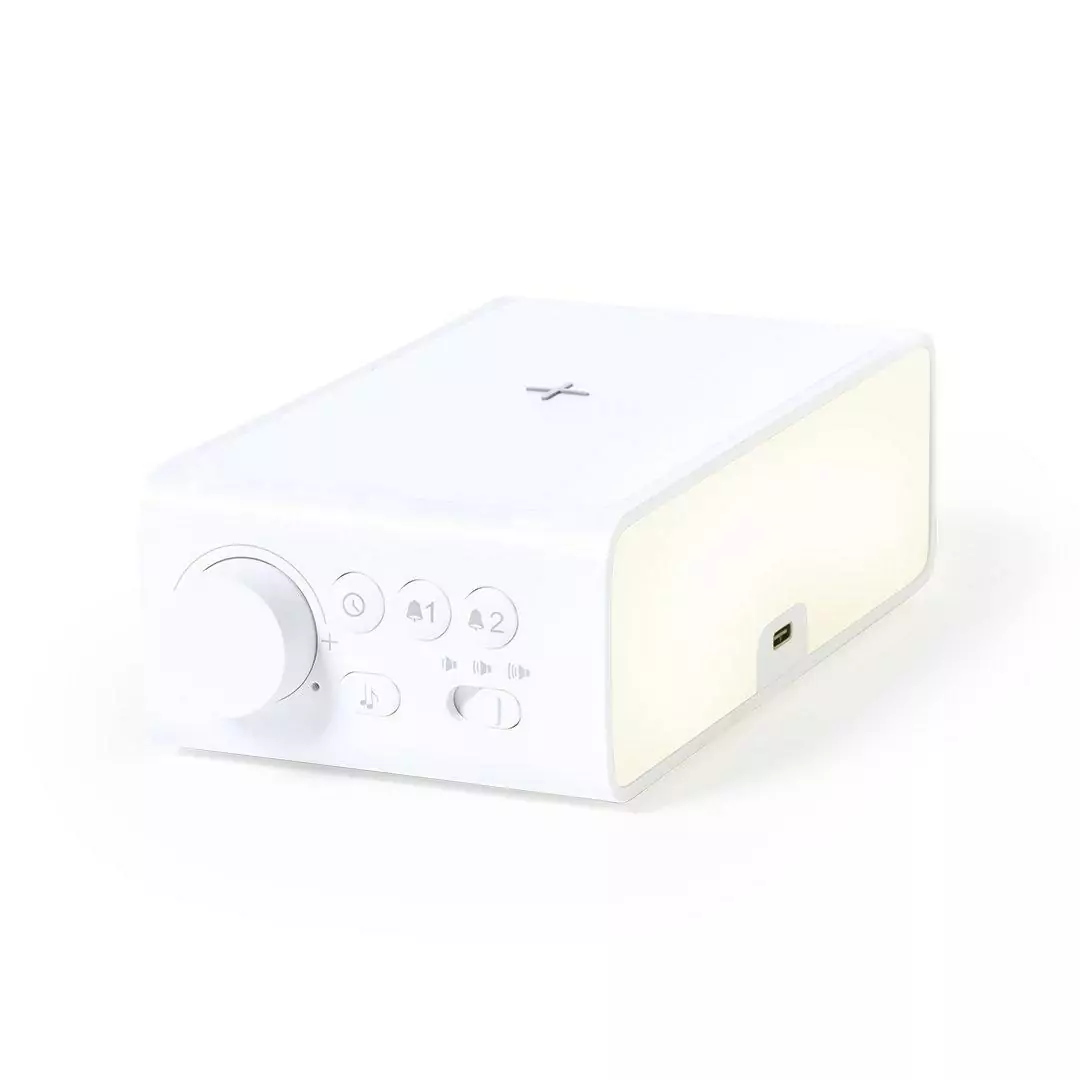 Montre multifonction au design élégant de couleur blanche avec chargeur sans fil 10W intégré et lampe LED intégrée. Avec fonction date / heure, alarme et lampe 36 LED avec intensité lumineuse dimmable. Connexion USB, avec câble Type-C de 100 cm inclus et alimentation auxiliaire aux piles bouton (incluses). Compatible avec les appareils équipés de la technologie de charge sans fil. Présenté dans une boîte de design attrayante.