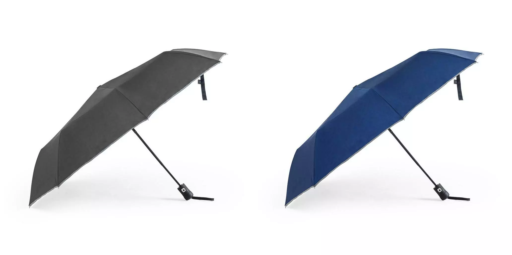 Parapluie pliant de la ligne nature de 100cm de diamètre. En pongee 190T matériau RPET, fabriqué à partir de plastique recyclé, afin de promouvoir la réutilisation des déchets plastiques et de contribuer à la durabilité de la planète. Avec bande réfléchissante autour du contour du parapluie. Ouverture automatique, avec mécanisme anti-vent et tiges en fibre de verre. Poignée avec bouton et badge RPET sur l’étiquette. Avec boîtier RPET assorti.