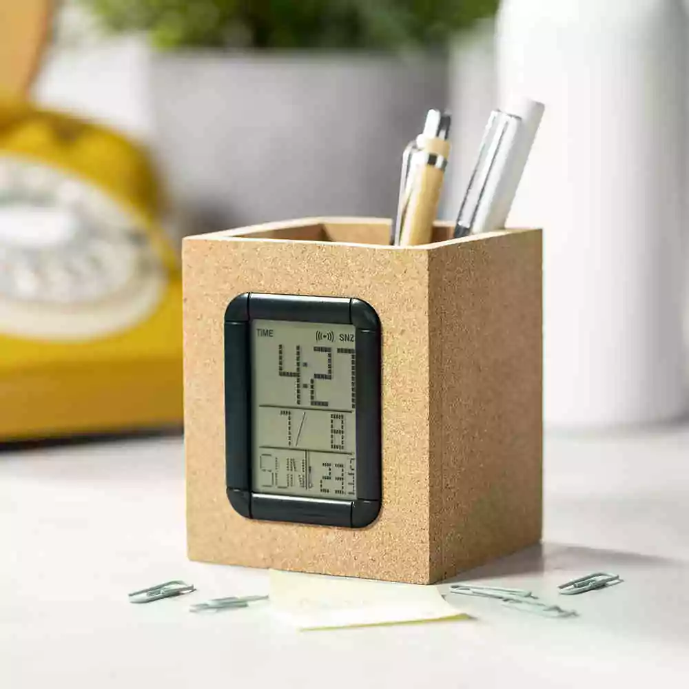 Stylo de la ligne Nature avec montre multifonction intégrée. Fabriqué en liège naturel, avec thermomètre, calendrier et fonctions d’alarme. Alimenté par batterie (bouton inclus) et présenté dans une boîte d’éco design attrayante.
