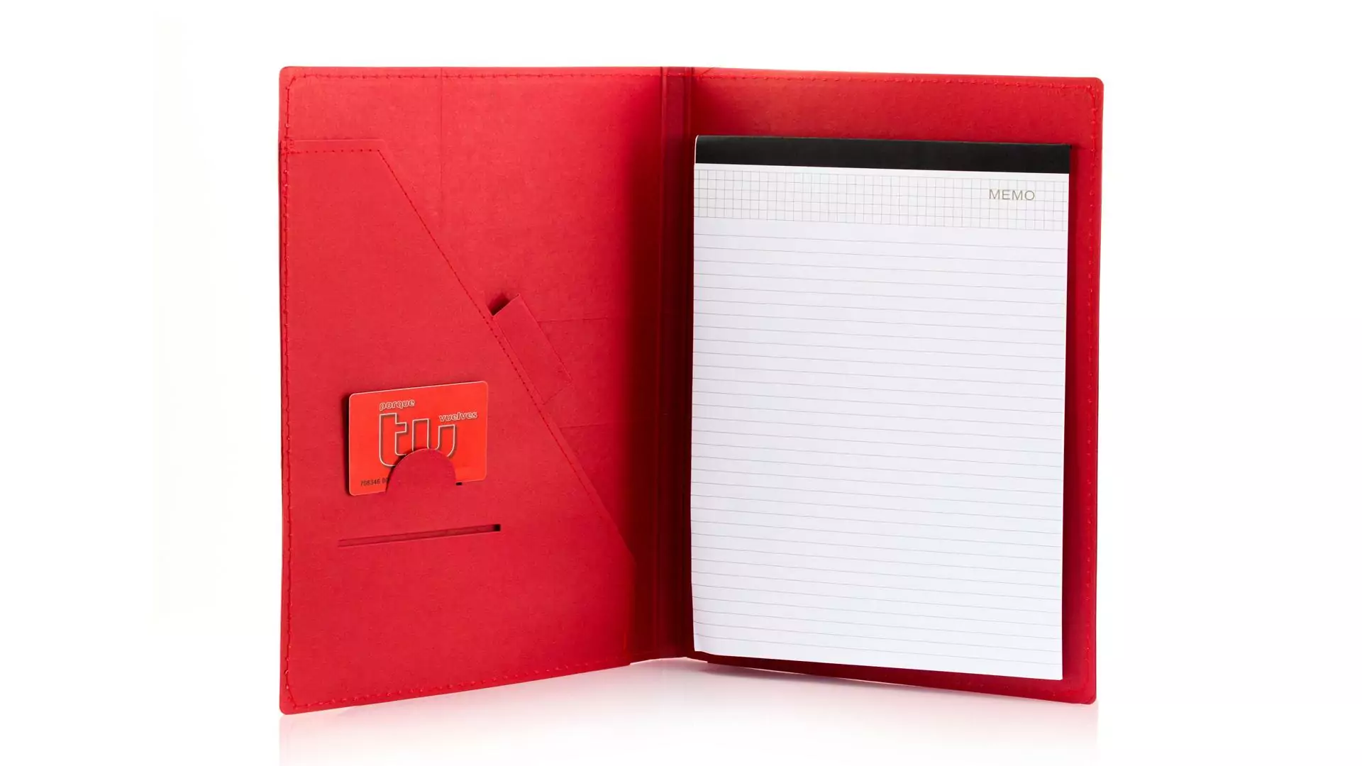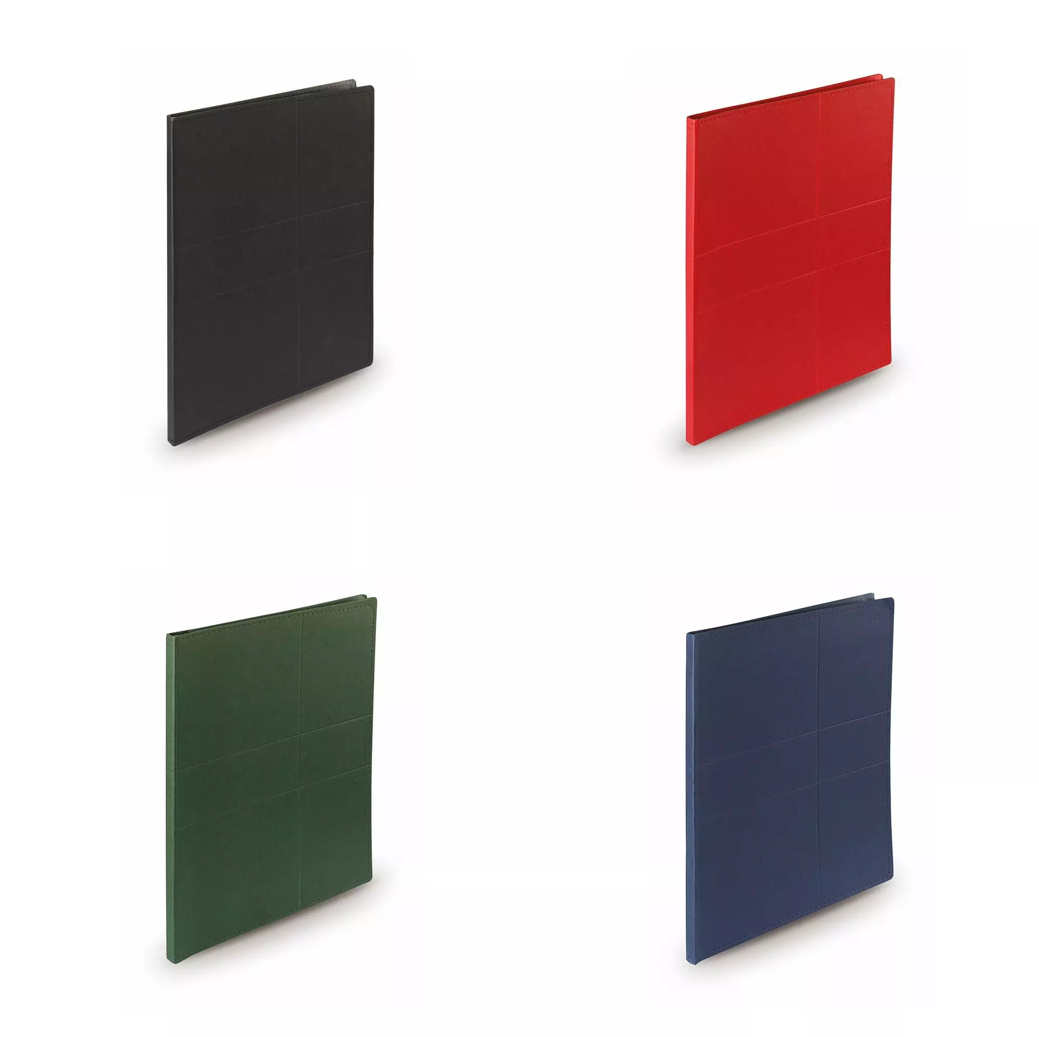 Conférencier en carton recyclé rigide et résistant avec coutures de renfort. Coloris variés. Intérieur avec bloc amovible de 25 feuilles lignées, poche rabat, porte-cartes et support pour stylo.