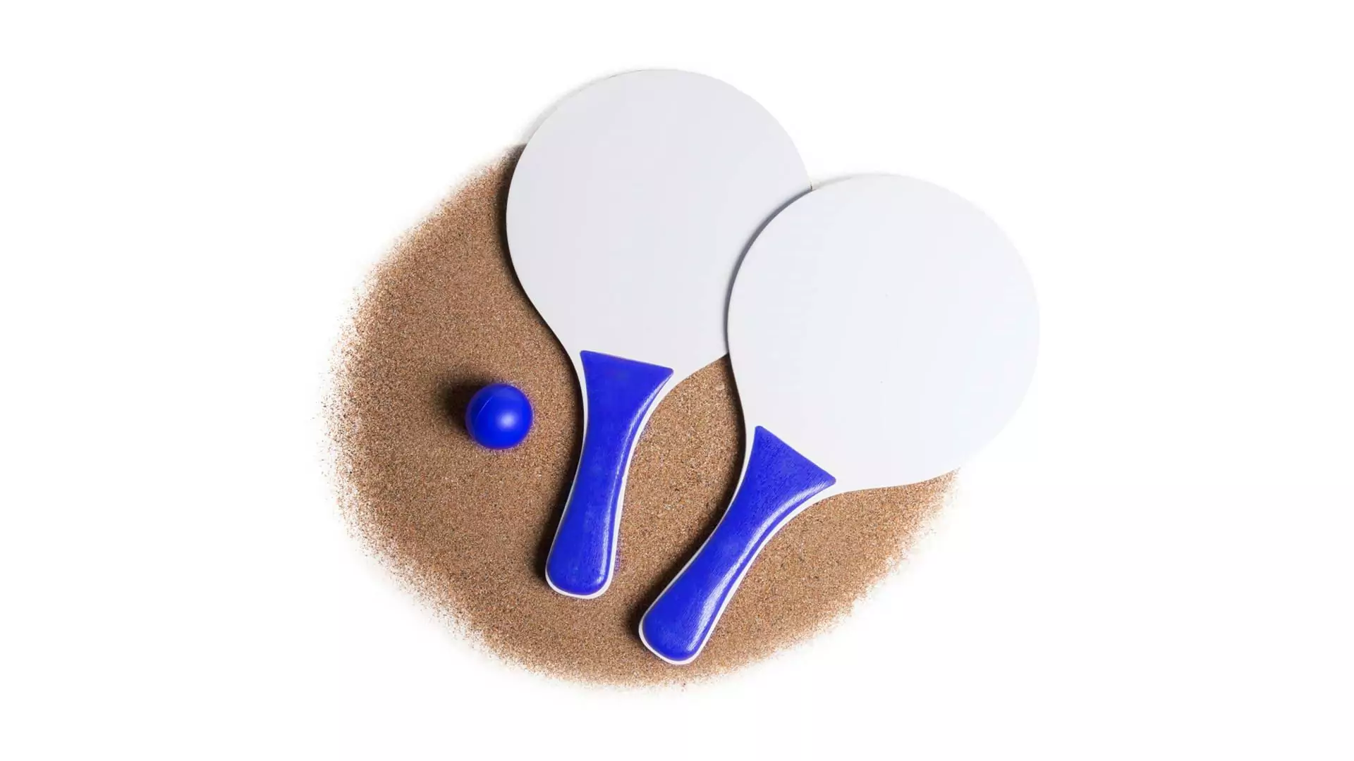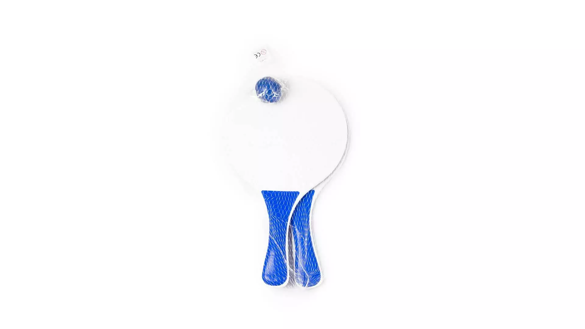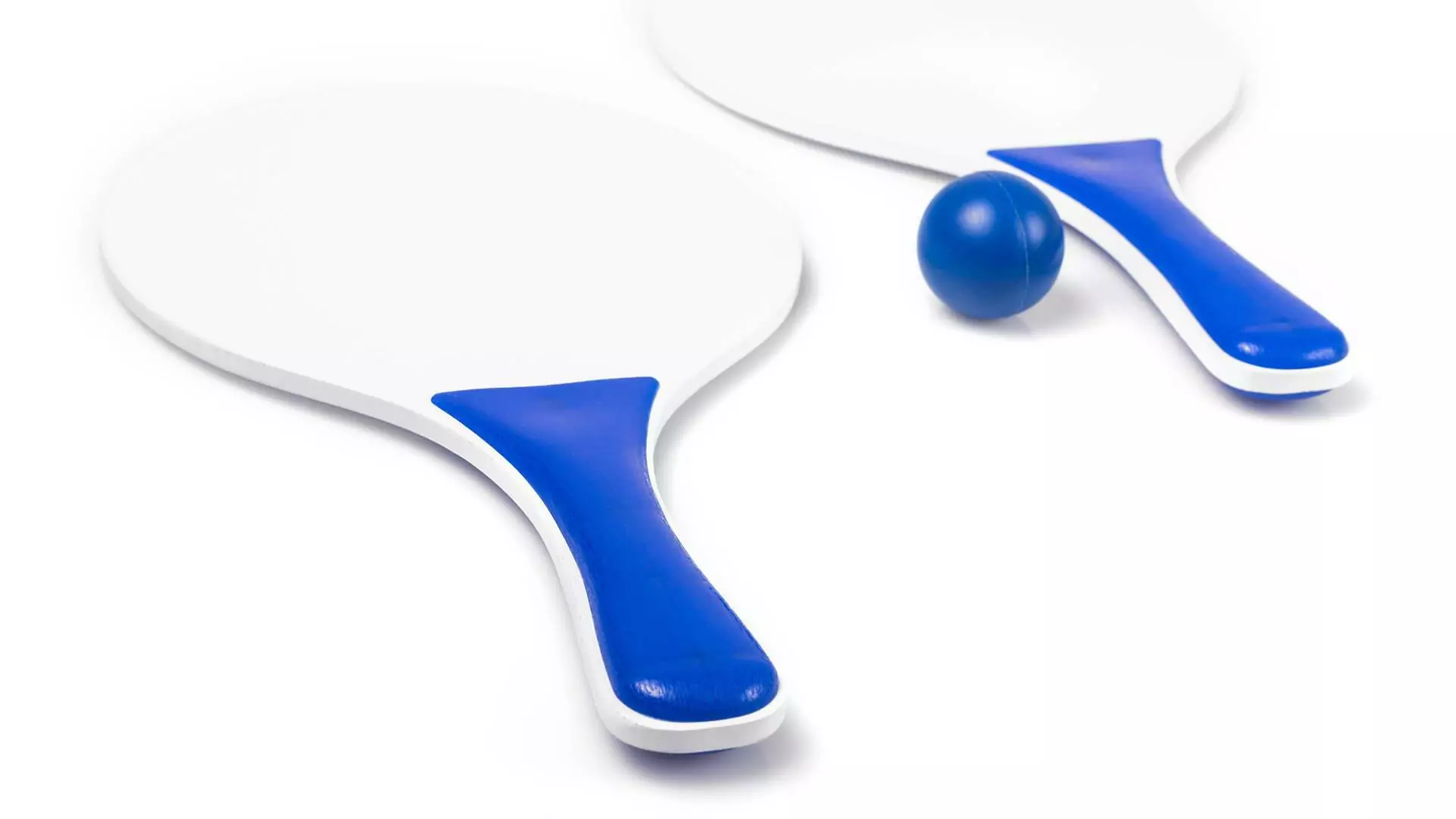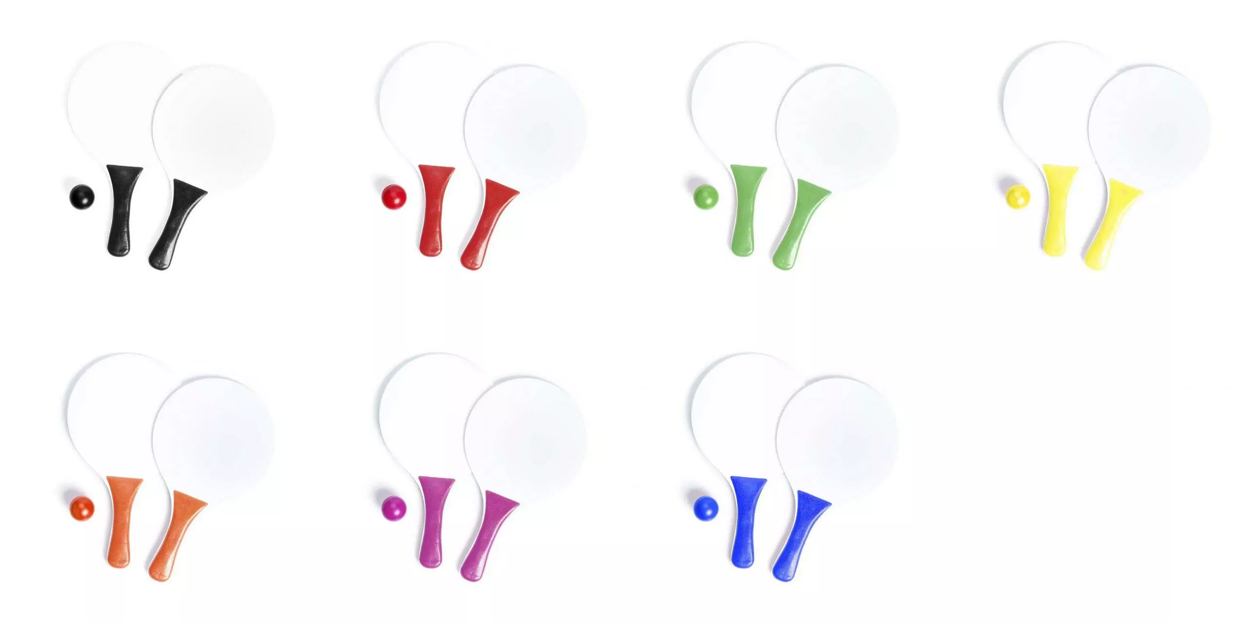 Paire de raquettes de plage en bois naturel avec manche renforcé dans une large gamme de couleurs vives. Présentée dans un sac en filet avec balle assortie.