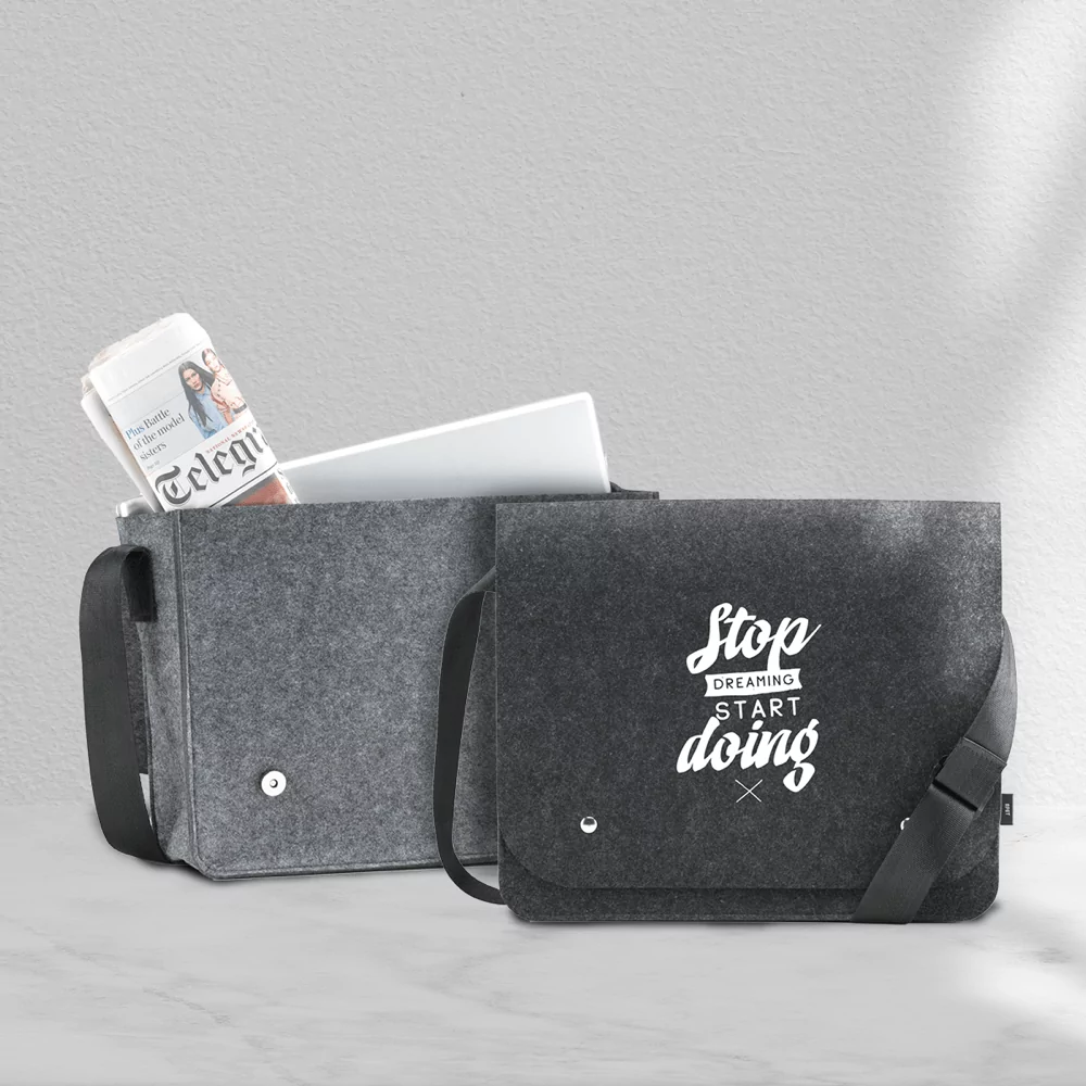 Soyez élégant et soucieux de l’environnement avec ces sacoches en feutre fabriquées à partir de bouteilles PET recyclées. Ils sont dotés d’un compartiment principal spacieux pouvant accueillir un ordinateur portable de 13 pouces, de deux boutons-pression magnétiques et de bretelles réglables. C’est le cadeau idéal pour toute votre organisation.