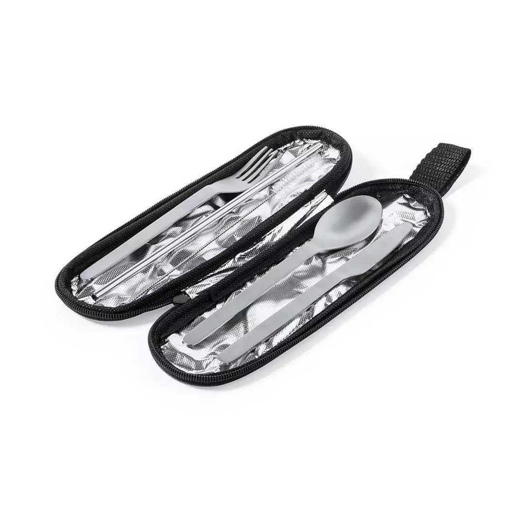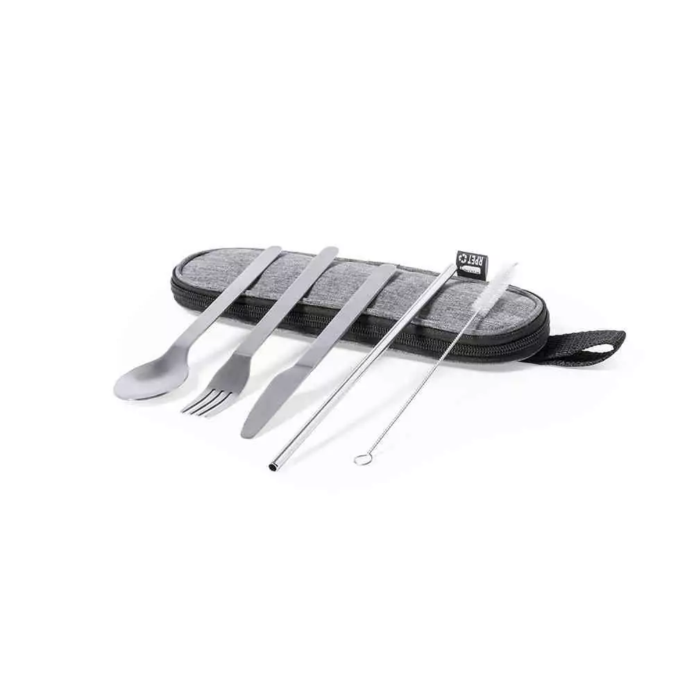 Ensemble de couverts réutilisables en acier inoxydable résistant et durable. Comprend une cuillère, un couteau, une fourchette, une paille et un accessoire de nettoyage. Présenté dans un élégant étui individuel en polyester 300D RPET, fabriqué à partir de plastique recyclé pour encourager la réutilisation des déchets plastiques et contribuer à la durabilité de la planète. Étui avec bandoulière, fermeture zippée et étiquette RPET sur l’étiquette.