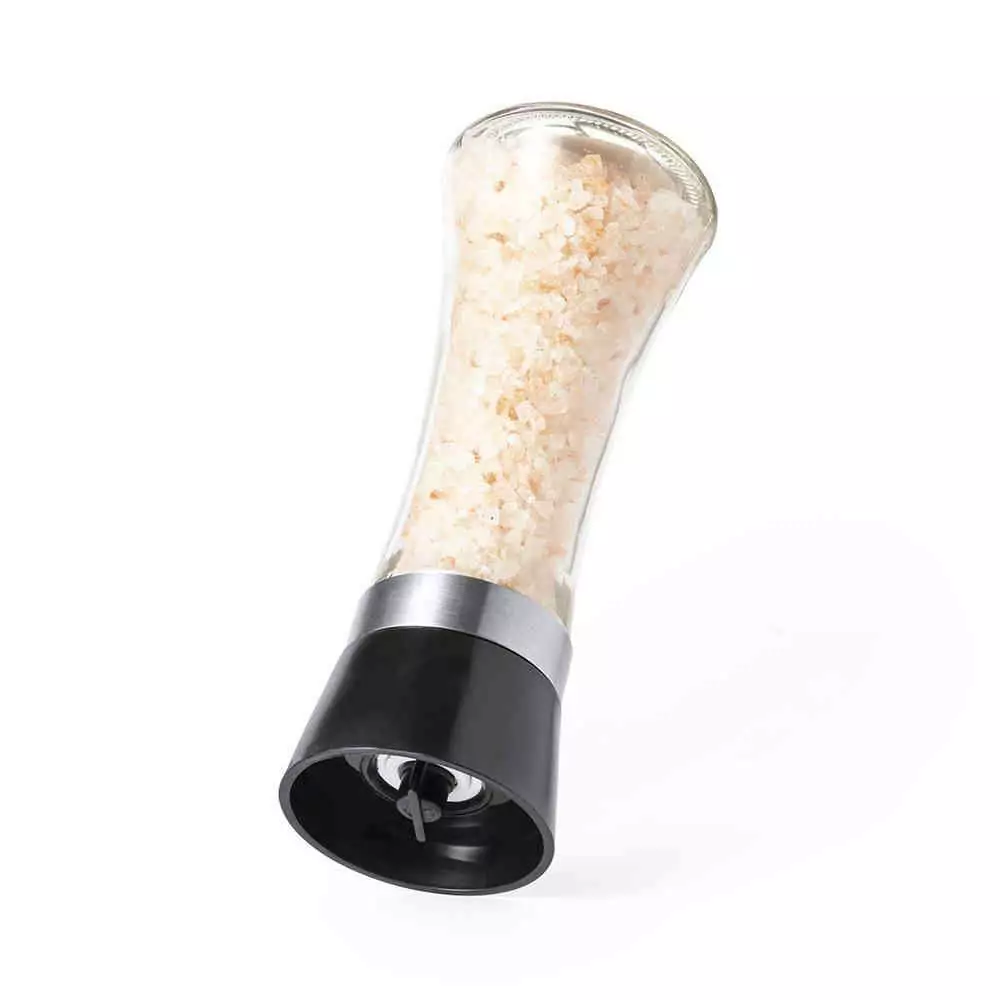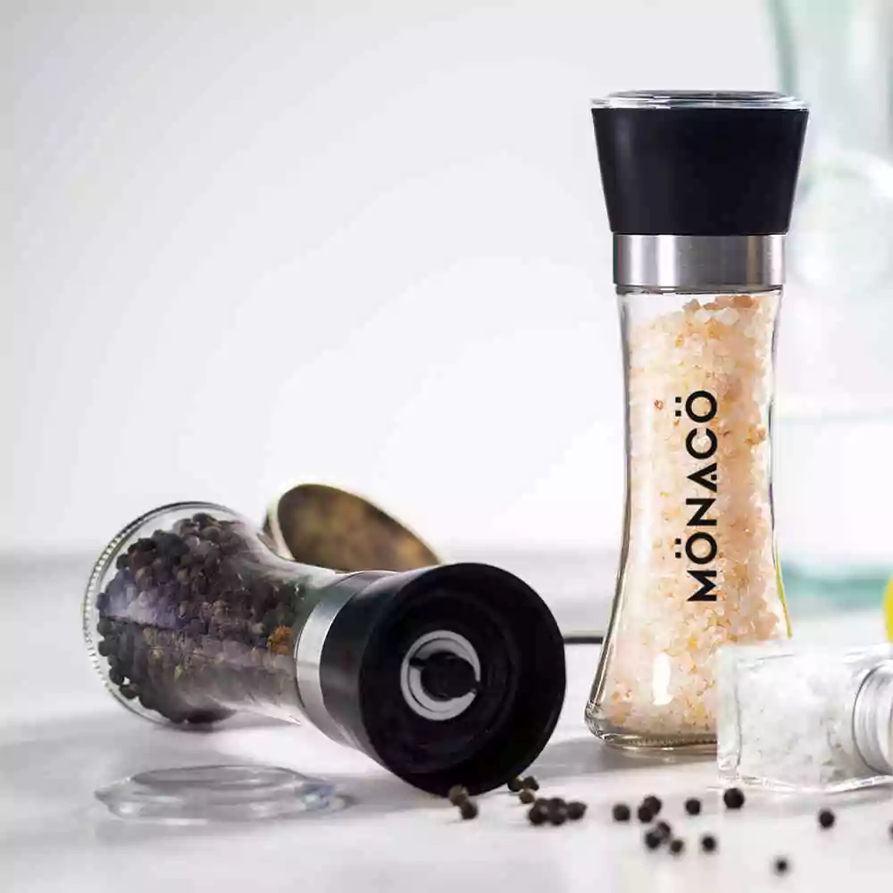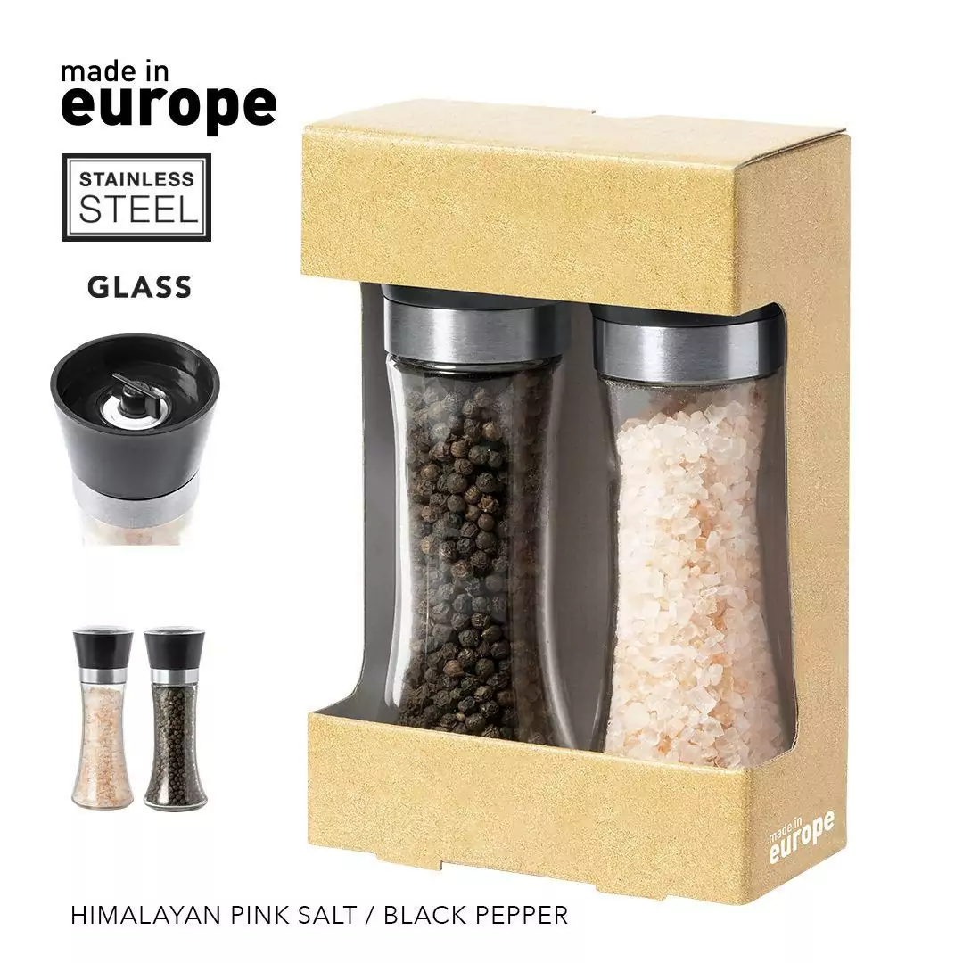 Jeu de 2 moulins, avec sel rose de lHimalaya et poivre noir. Fabrication européenne, en verre et en acier inoxydable. Avec mécanisme de broyage réglable et récipients rechargeables. Jeu présenté dans une boîte en carton avec fenêtre.
