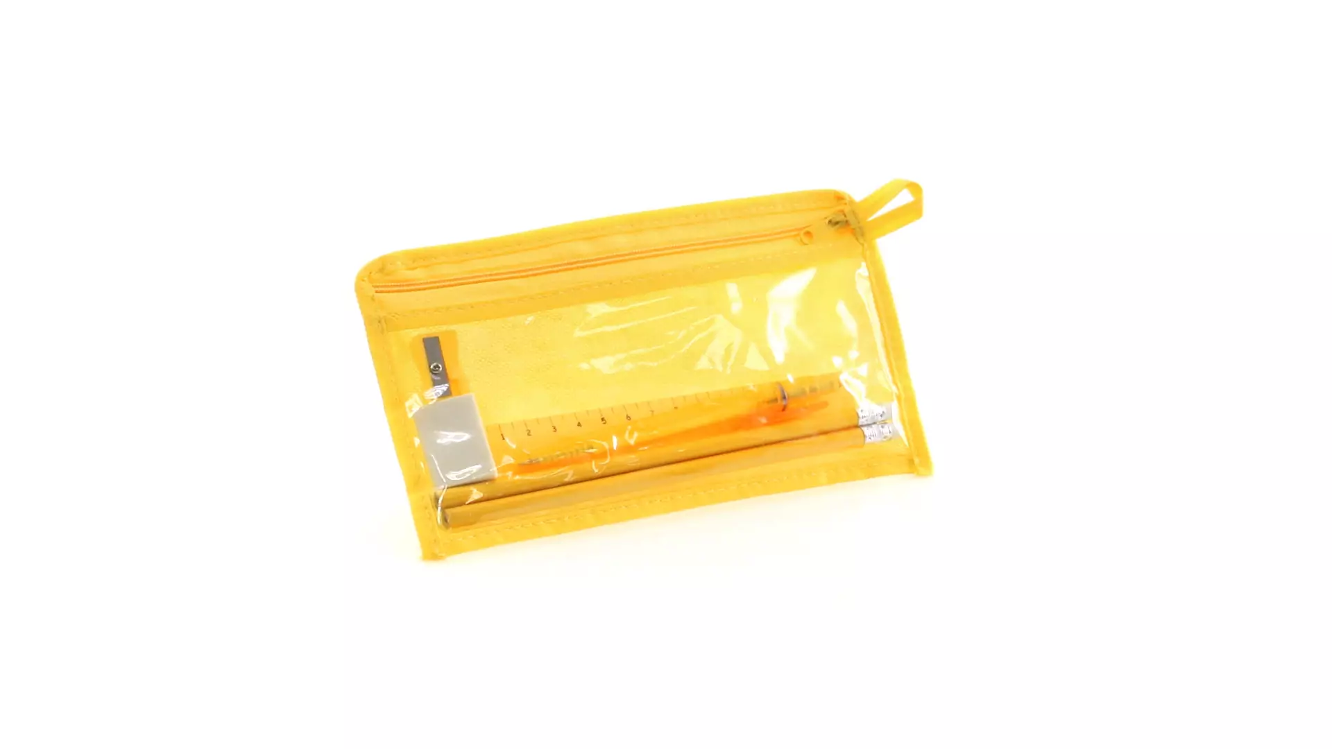 Set de 7 pièces dans une trousse en intissé avec fenêtre transparente frontale en PVC. Coloris vifs. Comprend 2 crayons papier avec embout gomme, corps cylindrique en bois, un stylo, une gomme, un taille-crayons et une règle de 15cm. Poignée de transport assortie.