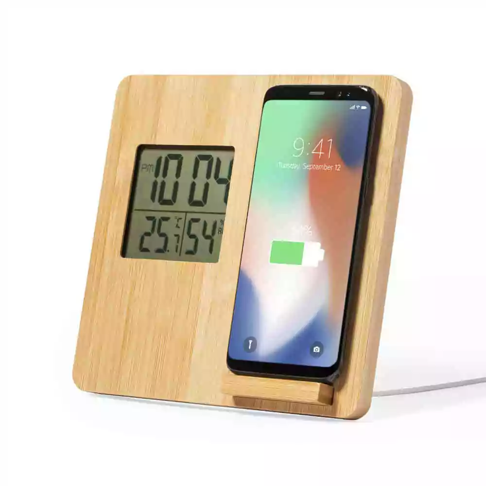 Station météo de la ligne Nature, avec chargeur de charge sans fil 10W intégré. Fabriqué en bambou poli et avec des fonctions de thermomètre et d’hygromètre. Comprend un câble de charge Micro USB de 1 m. Compatible avec les appareils équipés de la technologie de charge sans fil. Montre à piles (bouton inclus) et présentée dans un boîtier éco design attrayant. Manuel d’instructions disponible en espagnol et en anglais.