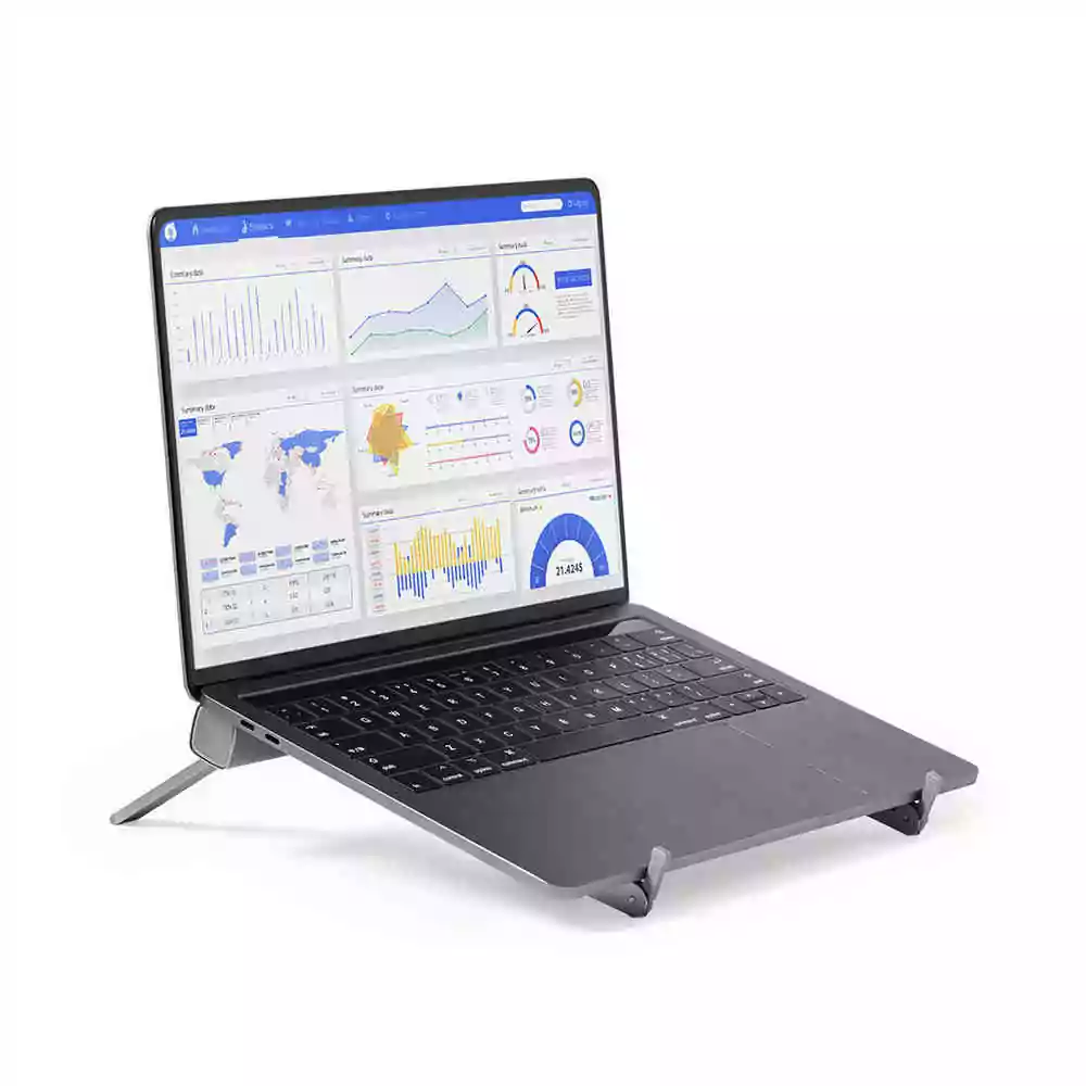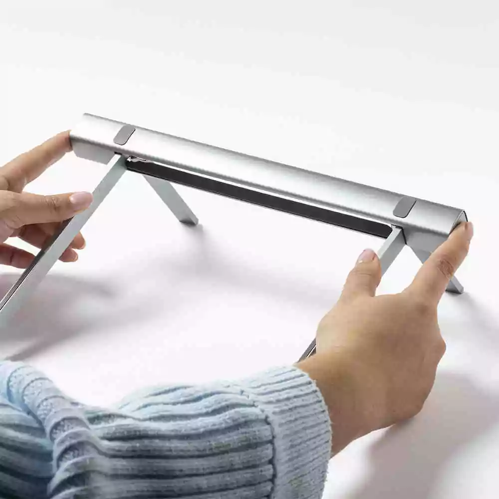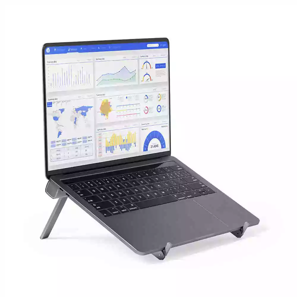 Support d’ordinateur portable pliable de qualité supérieure. Fabriqué en aluminium résistant, il comprend des pieds extensibles et réglables en hauteur, avec des protections en caoutchouc pour un ajustement ferme à l’ordinateur et au bureau. Pliage de taille compacte; présenté dans un couvercle anteline avec fermeture de cordon et dans une boîte de conception individuelle.