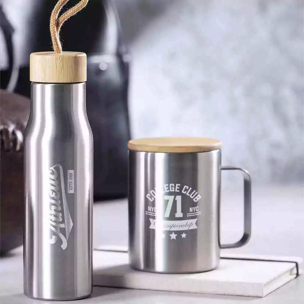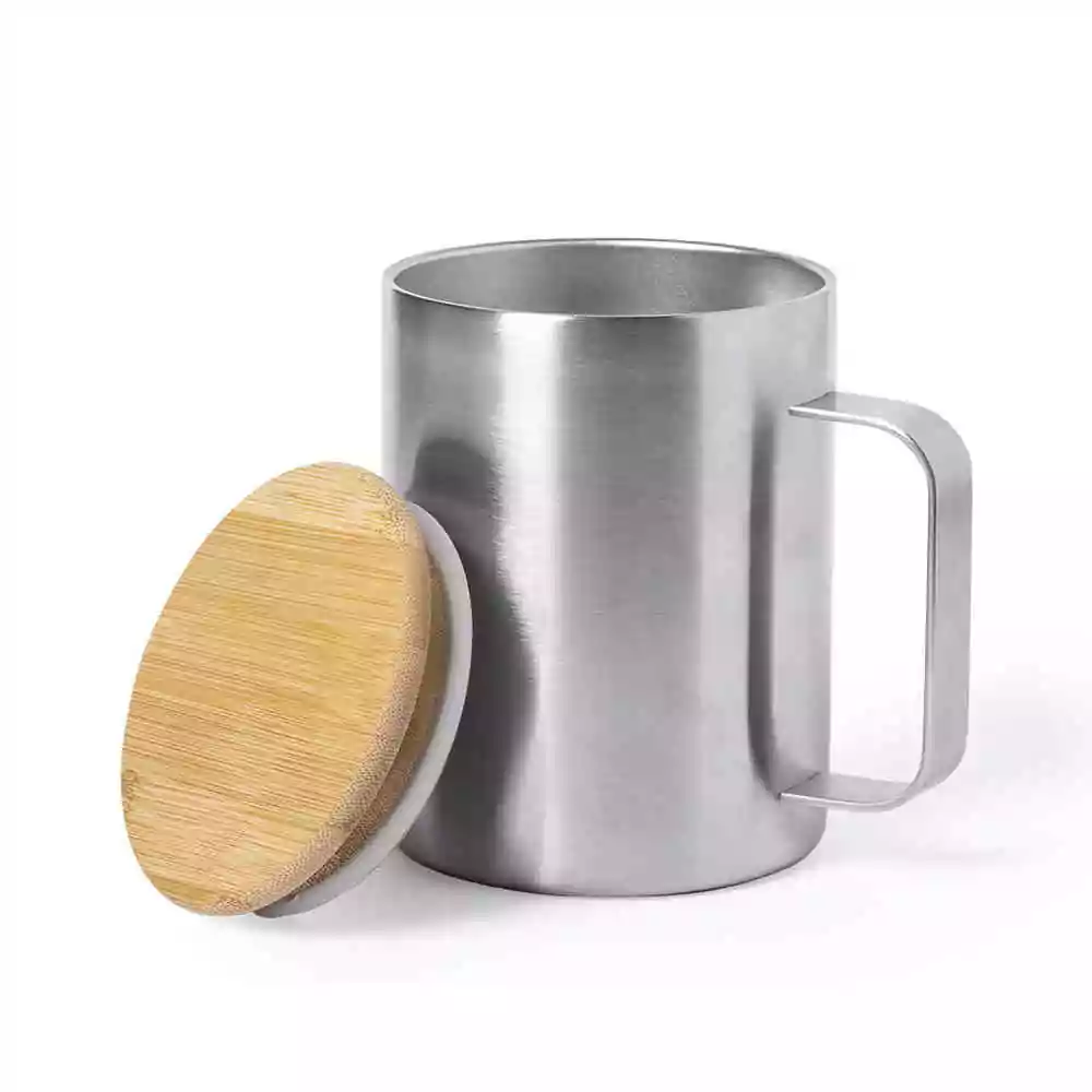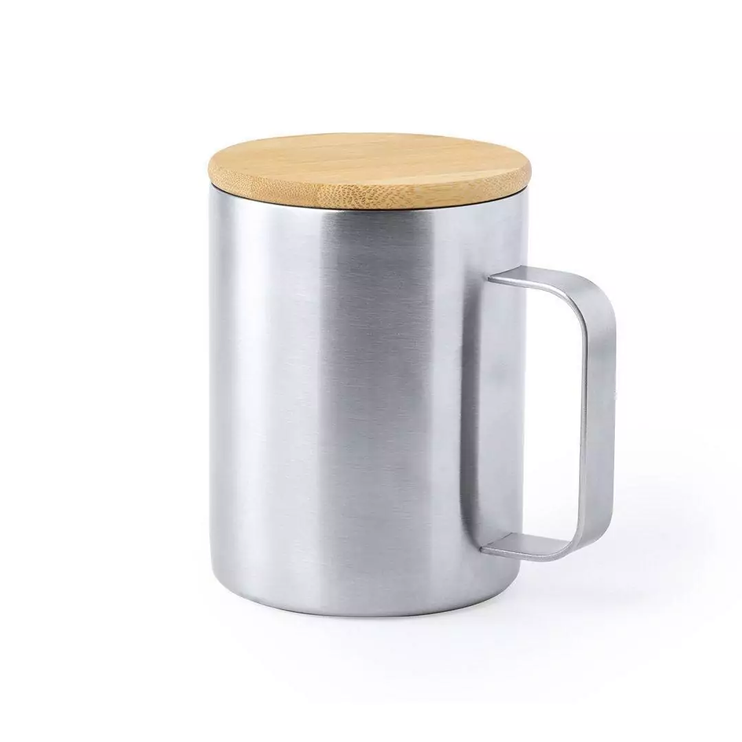 Mug isotherme en acier inoxydable dune capacité de 350 ml. Couvercle en bambou et présenté dans une jolie boîte éco design