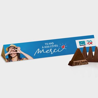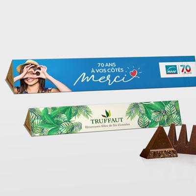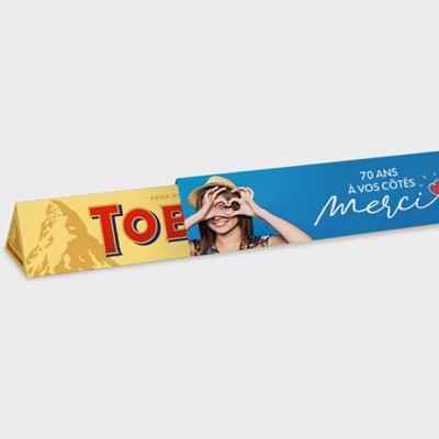 Le chocolat, un véritable plaisir pour les Français. Les fêtes de fin d’année approchent, et votre client souhaite faire plaisir à ses collaborateurs ou à ses clients ? Proposez-lui de personnaliser les Toblerone® au chocolat au lait. Notre atout ? Nous offrons la liberté de personnalisation selon ses désirs : choix des couleurs, visuels et textes. Idéal pour un cadeau de fin d’année, lors d’un événement spécial ou pour choyer ses clients, le Toblerone® est l’outil parfait pour véhiculer une image positive.