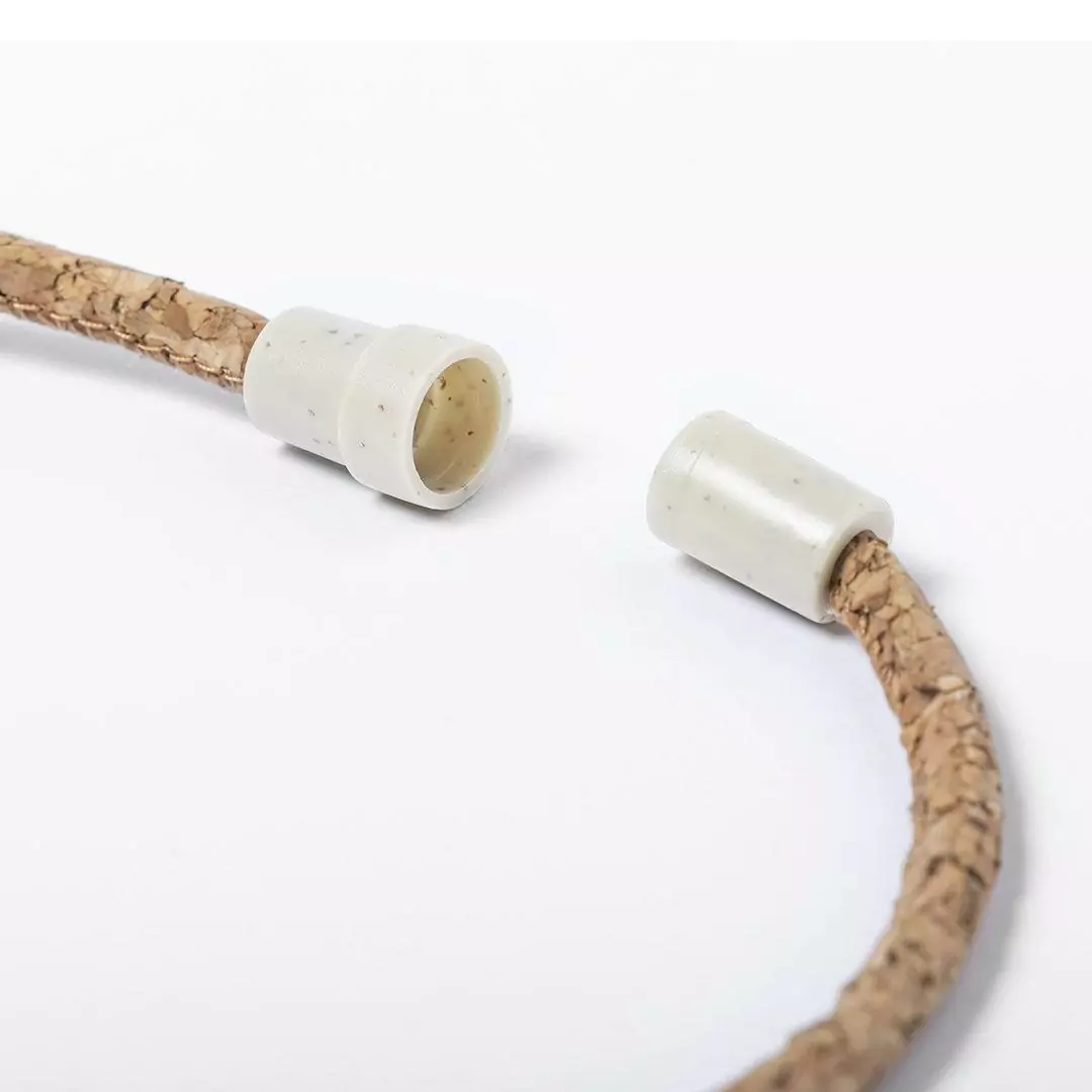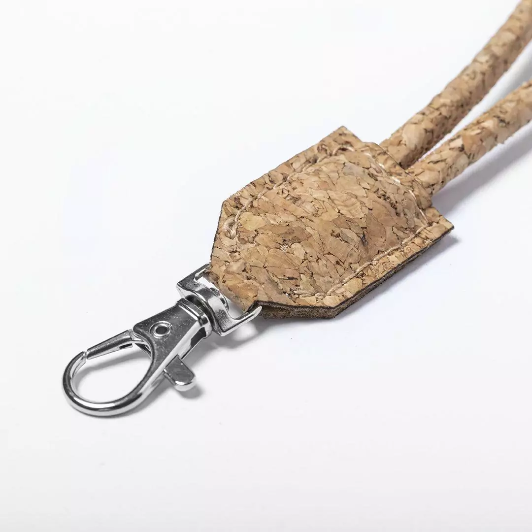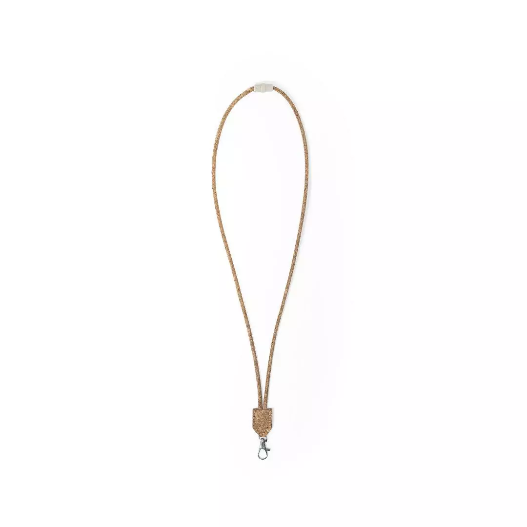 Lanyard de ligne naturelle en liège naturel avec finition tubulaire. Avec fermeture de sécurité pour le cou en tige de blé/PP et le mousqueton en métal. Inclut le ramassage central de liège pour l’impression.